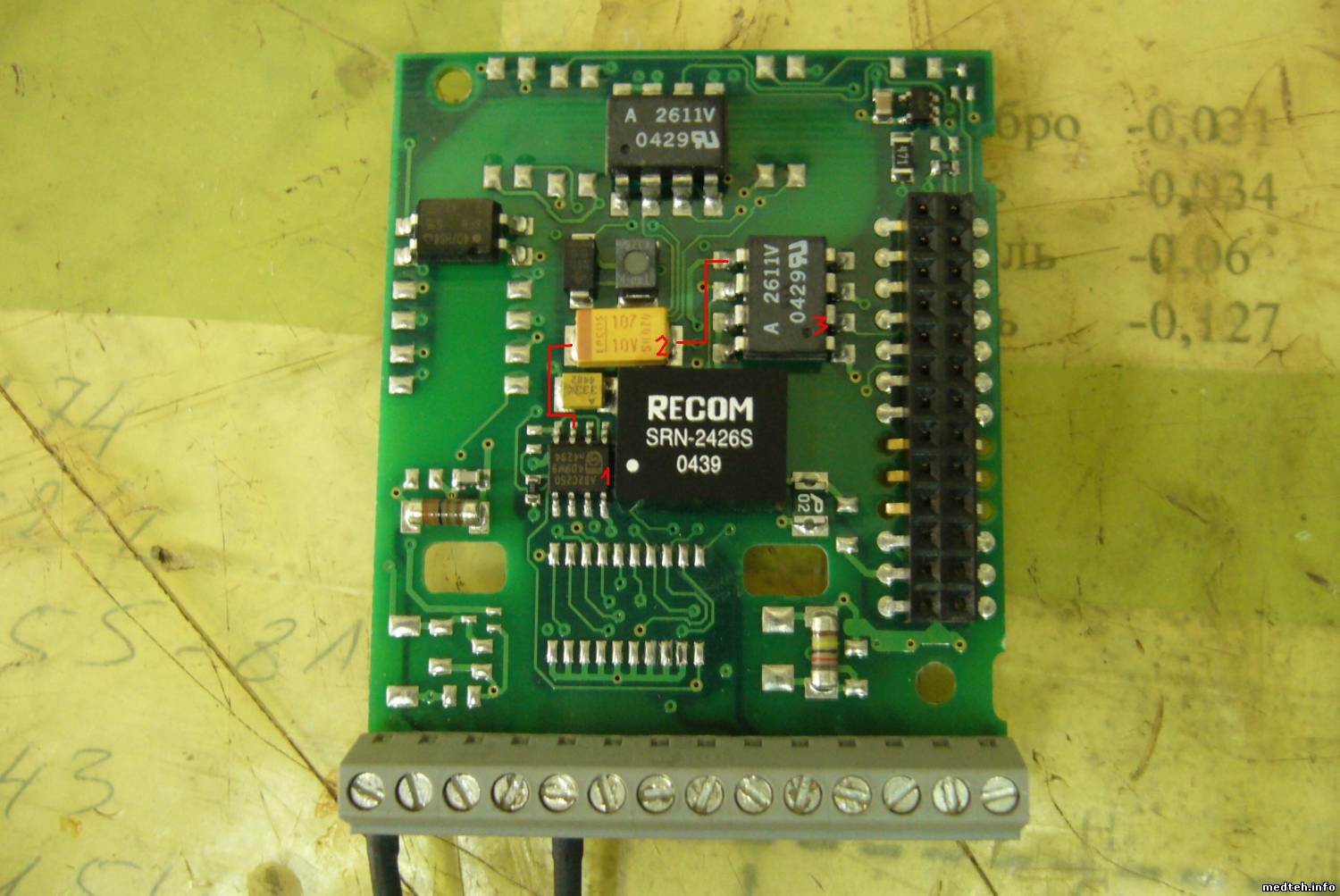 Так и так понятно что дальше... Хотя обратную сторону платы все таки хочется увидеть... В первую очередь надо проверить исправность "самовосстанавливающегося" предохранителя ( зелененький элемент около правого нижнего по фото угла DC/DC конвертора SRN-2426S фирмы RECOM)... Если он исправен, т.е. звонится, проверяем исправность DC/DC конвертора SRN-2426S фирмы RECOM. Именно он питает ПРИЕМО-ПЕРЕДАТЧИК ( а не контроллер!!!) 82C250 и оптрон hcpl2611... Для этого измеряем какое напряжение приходит на него, на предохранителе. Так же можно просто подать 5В на 82C250 , если КЗ не случиться, то менять конвертор... И если он не работает то ищем замену на такое же входное напряжение и выходное напряжение 5В.