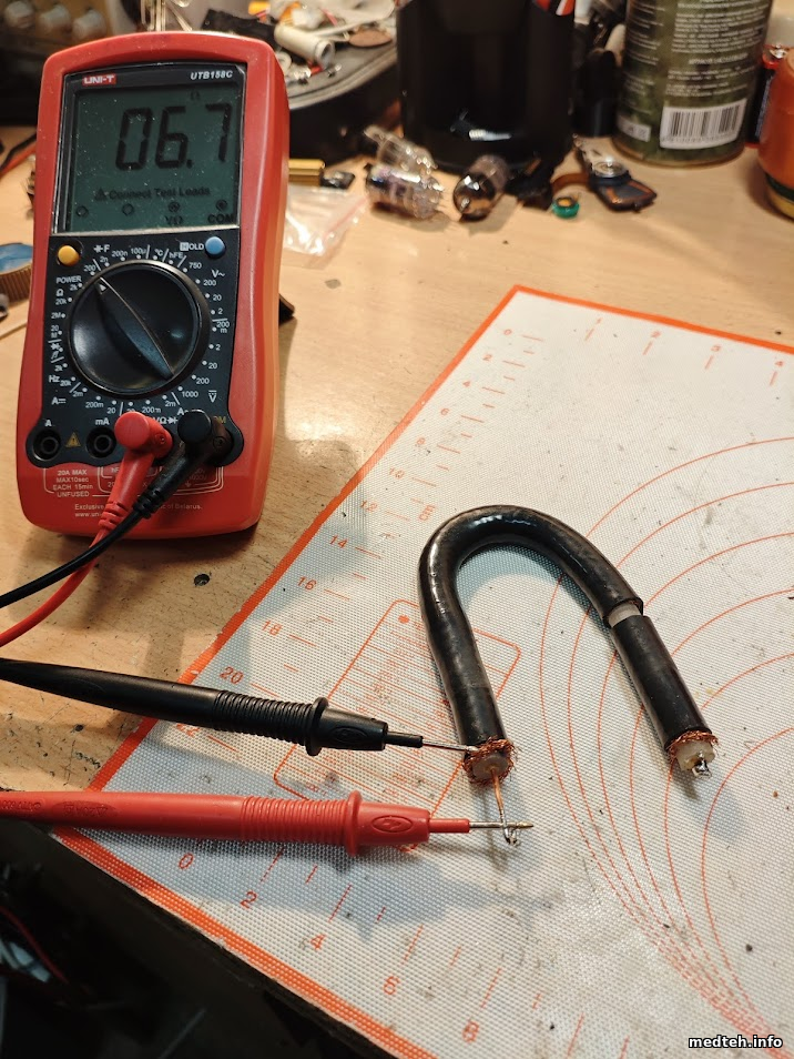 В общем, виток-катушка связи сплавилась - тогда отремонтировал, сейчас ещё один такой же пришёл - с такой же проблемой. Проверяется очень тяжело - надо разобрать, снять крышку с фильтра низких частот (на перегородке между генераторным блоком и контуром пациента), распаять концы и прозвонить мегаоометром. А можно и тестером - это когда явный уголь уже. .