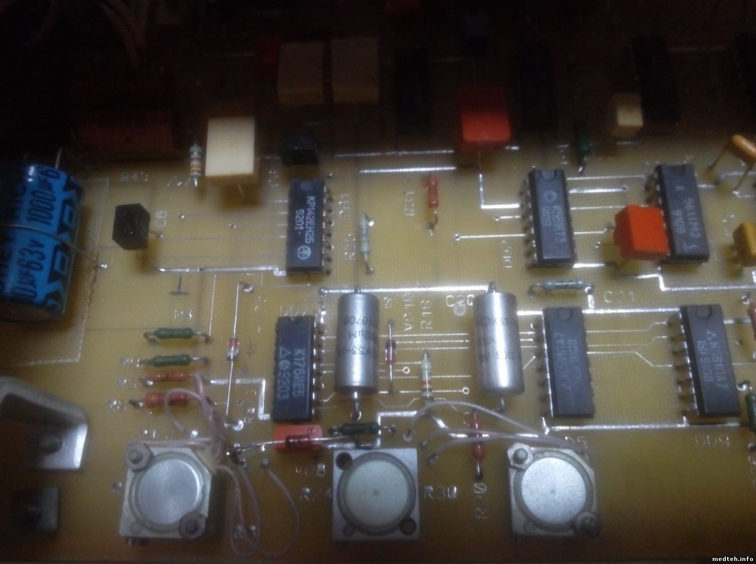 Сей аппарат возможно работал бы еще долго. Но внутри выкрутился винт крепления платы и закоротил что-то. Начал звонить цепи питания. Вышел на стабилизатор питания КР142ЕН2Б, установленный в цепь источника питания +12V.