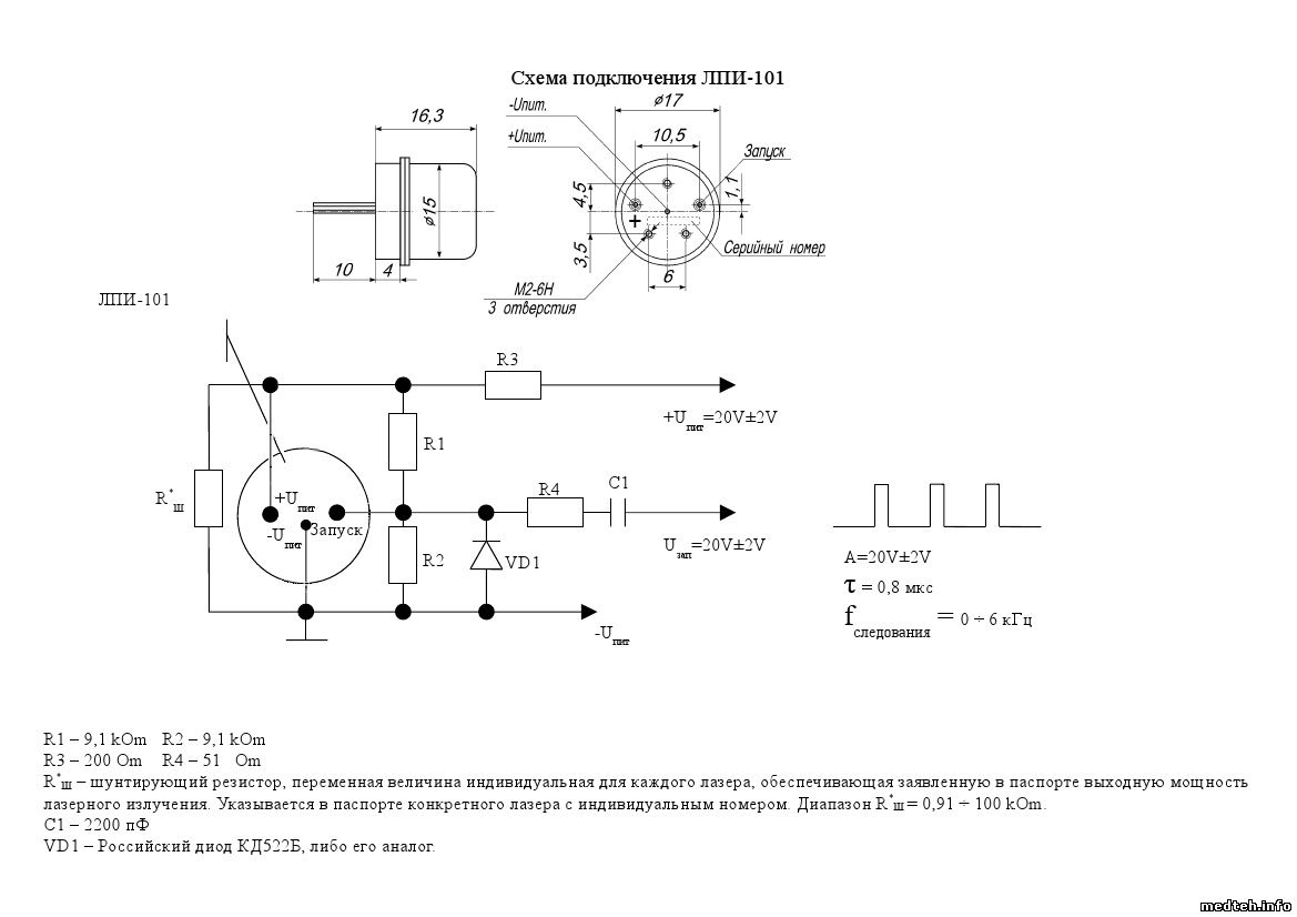 Схем конечно нет, есть только паспорт. Марка лазера ЛПИ-102, и в комплекте шёл запасной.