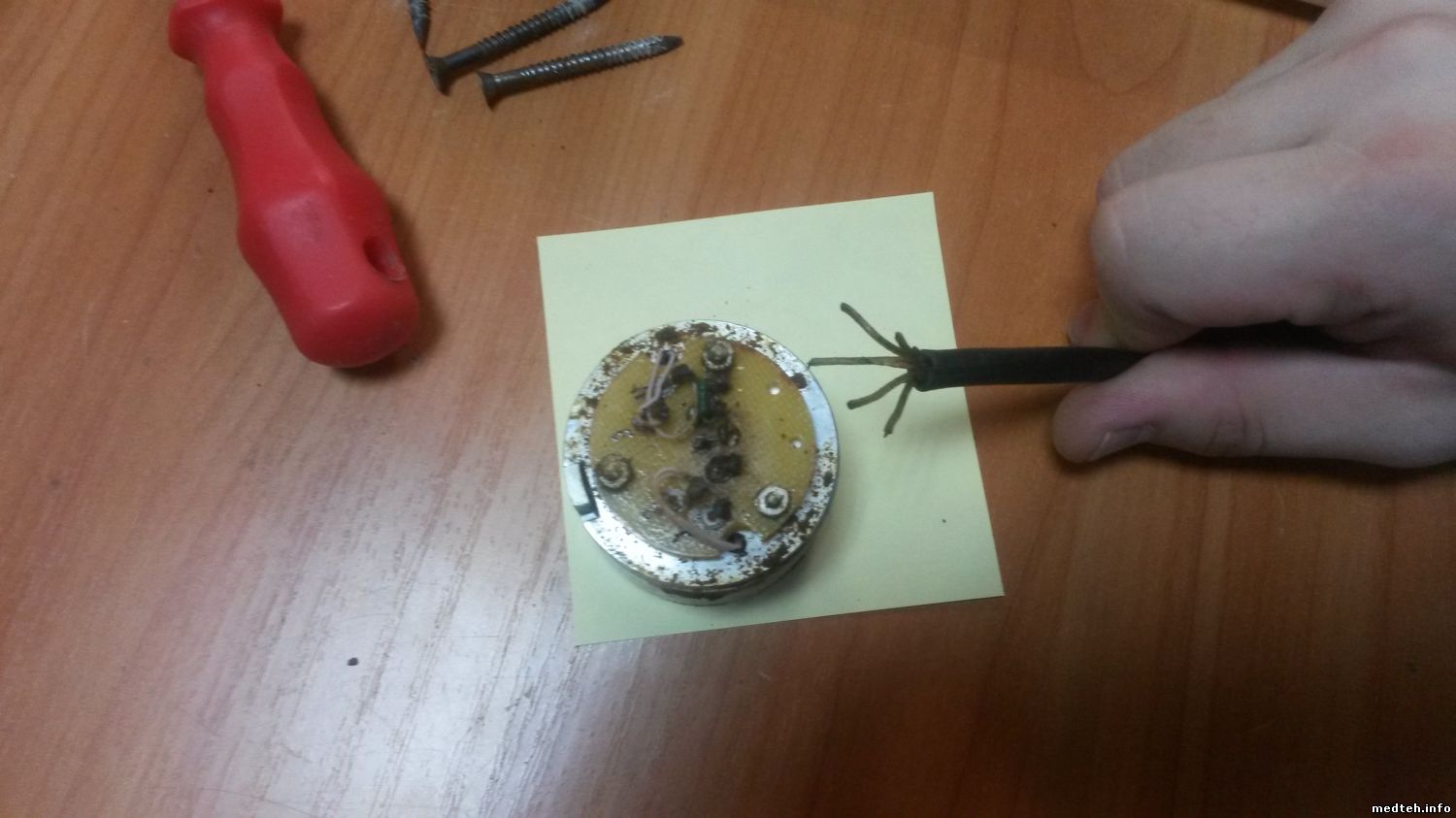 Добрый день! Нет ли у кого распайки для излучателя Милты 1993 г. или схемы? Персонал оторвал все провода, не понятно что куда паять. Ниже прикладываю фото прибора и головки излучателя.