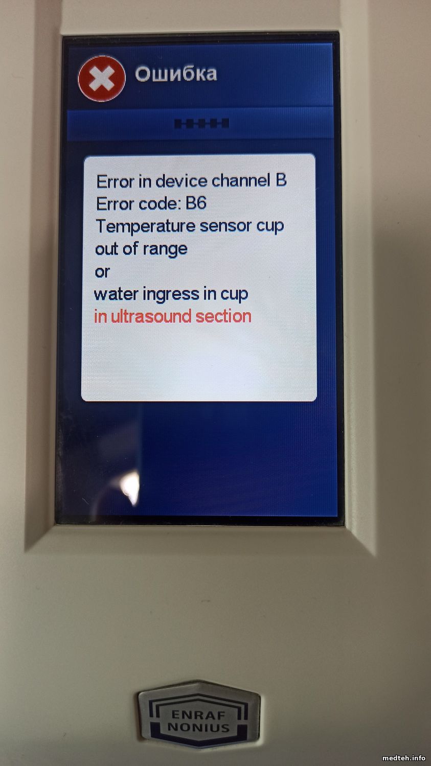 Здравствуйте. На аппарате Sonopuls 190 фирмы Enraf-Nonius, 2018 года REF 0631.900 появилась ошибка: "Error in device channel B Error code B6 Themperature sensor cup out of range or water ingress in cup in ultrasound section."