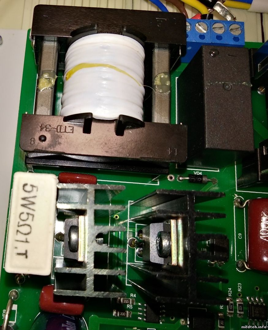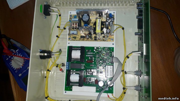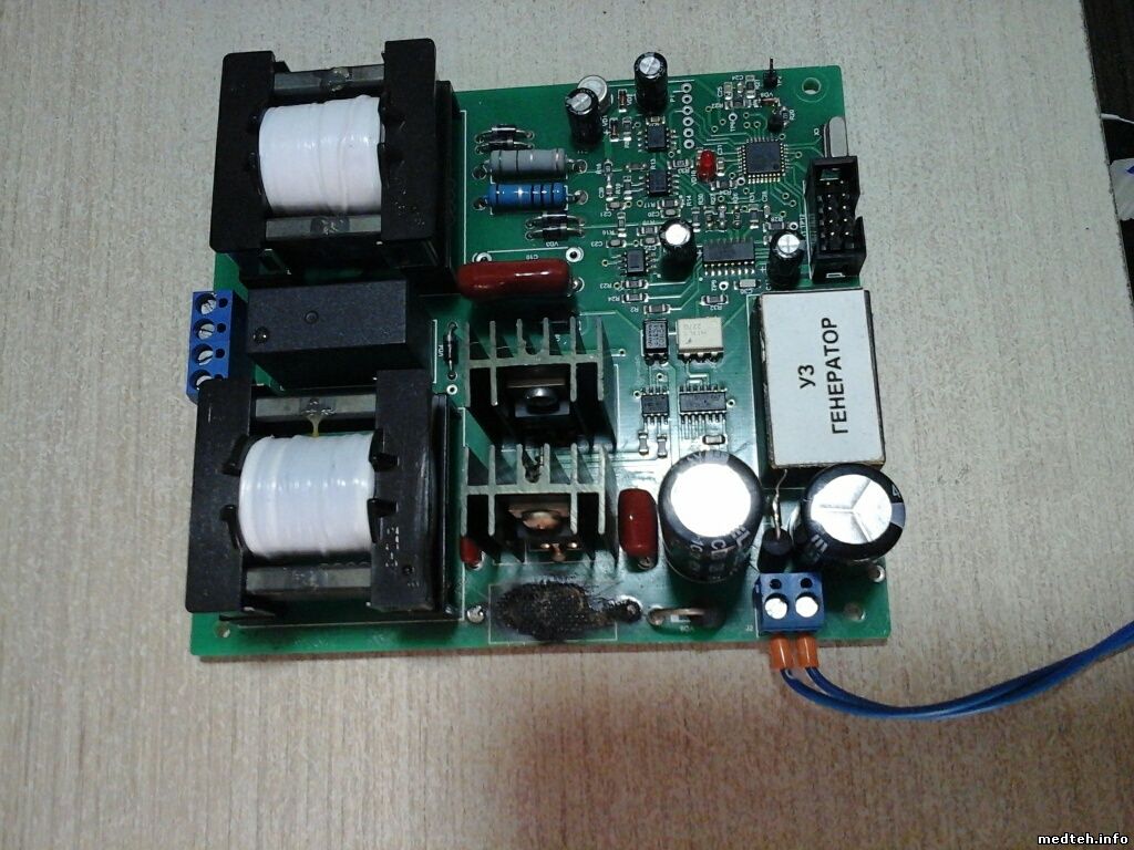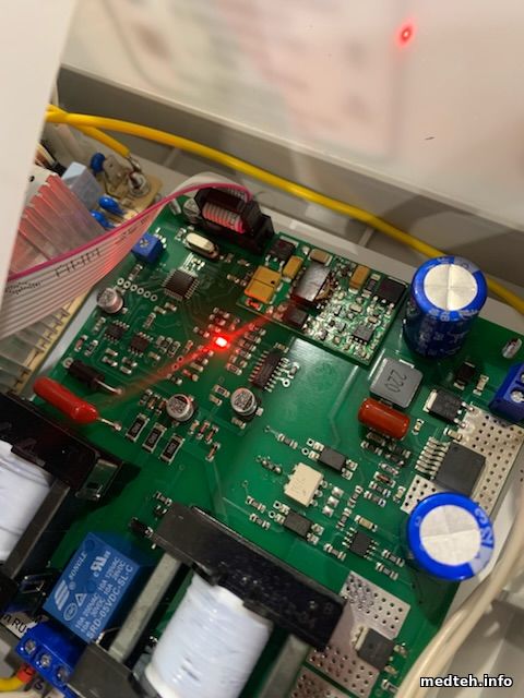 При нажатии на пуск или педаль, УЗ волновод работает только на долю секунды потом только слышен бесполезный писк УЗ, но резонанса нет. Осмотрел плату, внешне никаких подозрений, для полной проверки необходима схема. 1. Аппарат лечит за счёт ультразвукового воздействия на поврежденные ткани человека при низких частотах и вакууме. 2. Может быть причина в неисправности в том, что УЗ генератор теряется в частоте, или же где-то коротнуло и аппарат уходит в защиту. 3. Проверял оба канала, проверял волноводы, туго закручивал, бесполезно.
