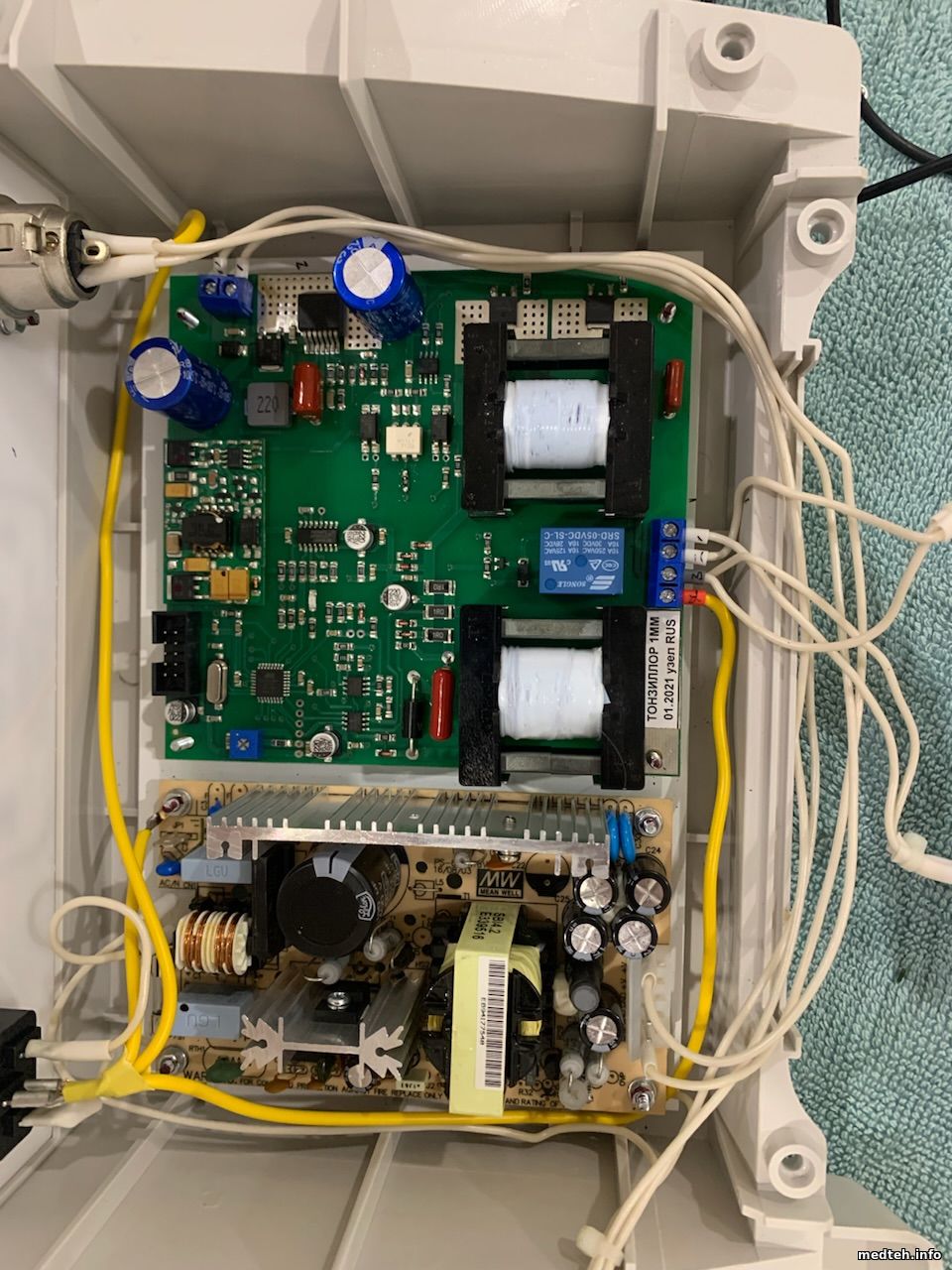Добрый вечер. Имеется аппарат "Тонзиллор-ММ" 2021 г.в. Плата управления Тонзиллор 1ММ 01.2021 узел RUS Проблема заключается, что при нажатии кнопки «Пуск» на секунду аппарат создаёт УЗ, но после просто писк. На плате загорается красный светодиод. Если нажать «Стоп» и заново «Пуск», всё также - секунда и писк. Смотрел плату, "погорельцев" не увидел. На УЗ генераторе на выходах 5 В стабильные, даже при включении красного индикатора. Где искать проблему? Если УЗ генератор, то есть вариант узнать что за зверь? Тему соседнюю видел, ответа не нашёл.