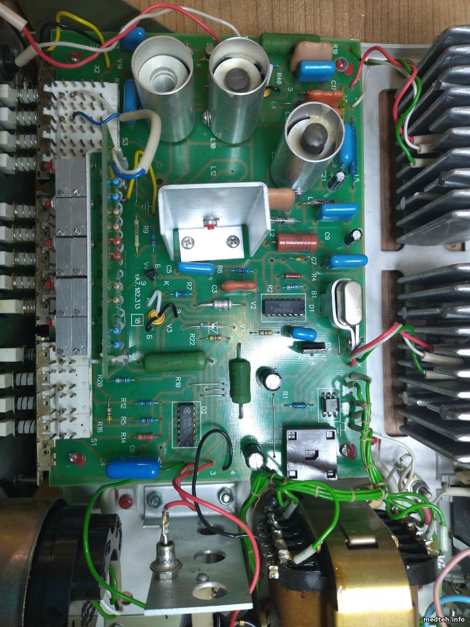 Аппарат УЗТ 1.01Ф 90-го года, при нажатии кнопки выбора излучателя происходит загорание светодиода и он сразу тухнет, в чём дело и куда лезть (излучатель в порядке)?