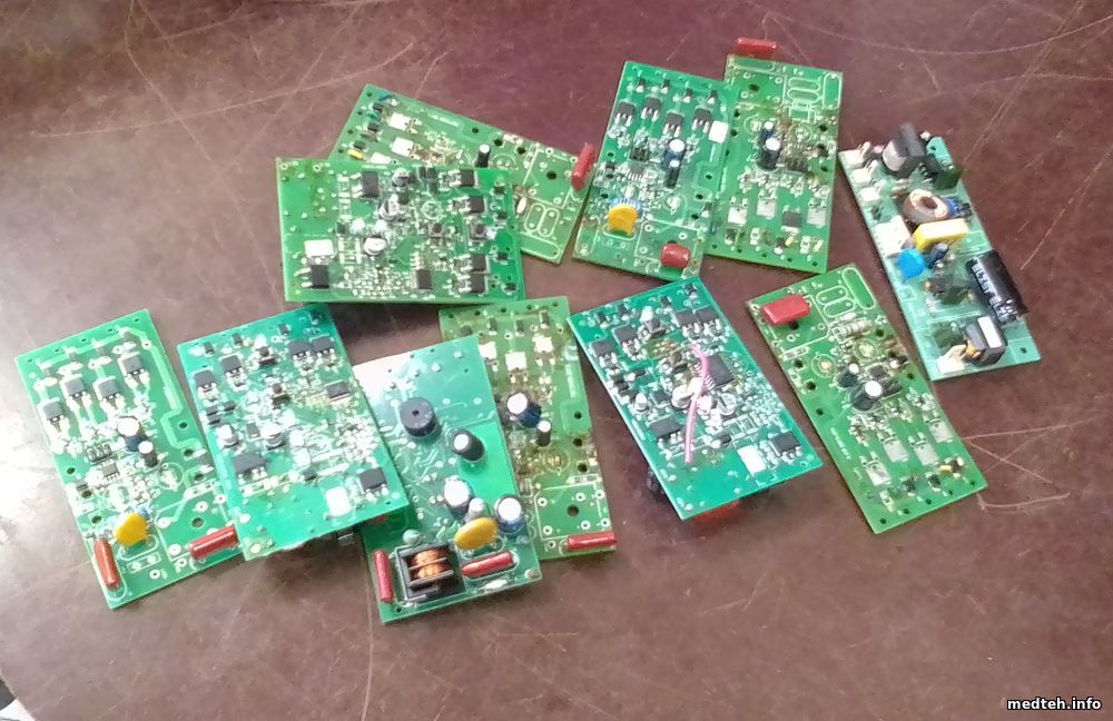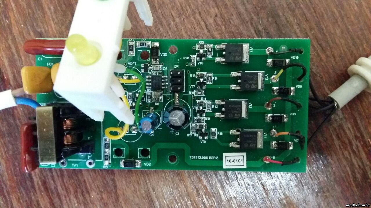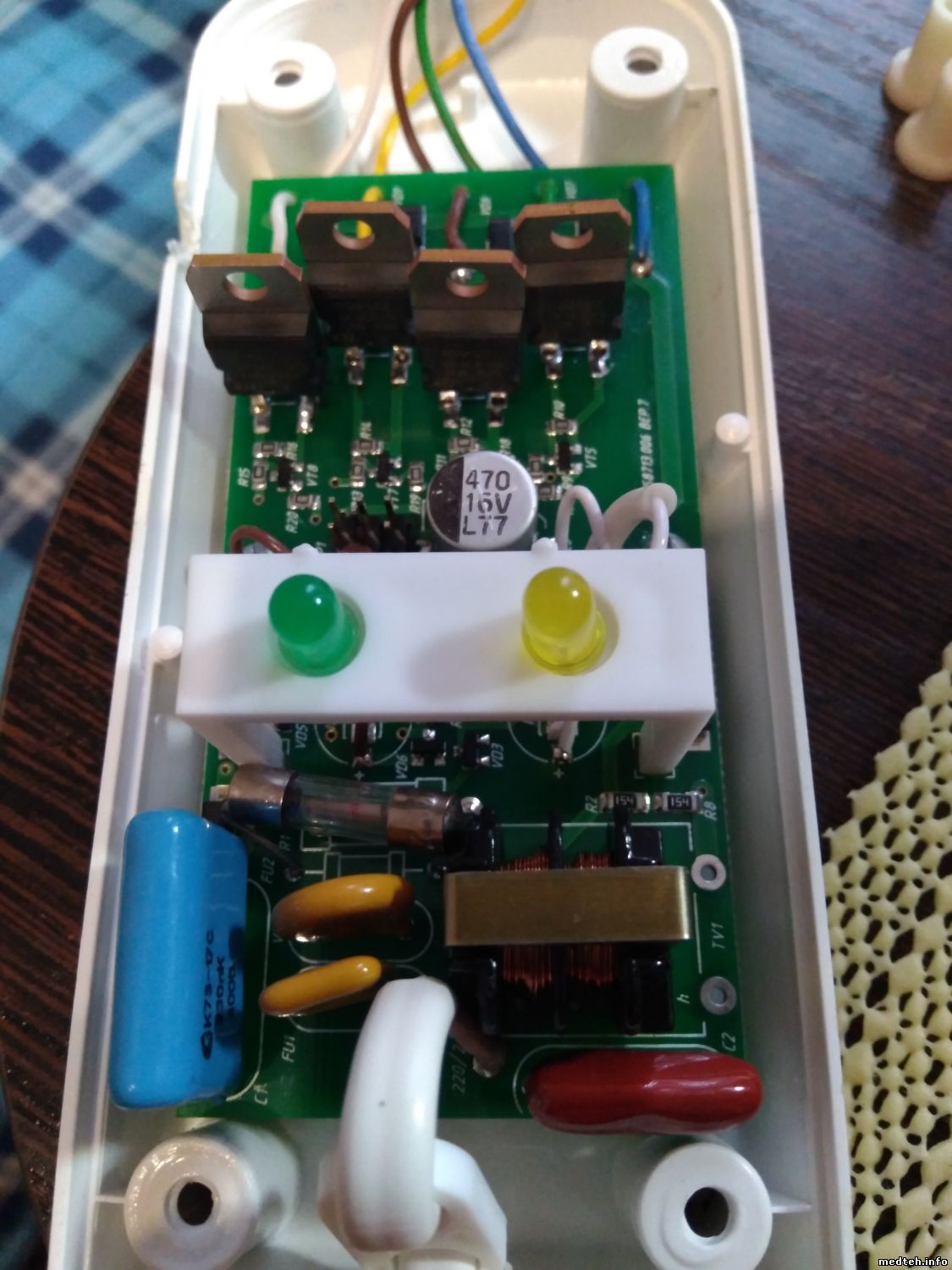 Имеется аппарат 2004 г.в. Отличительные признаки: большой корпус, трансформаторный блок питания. Причина ремонта: не работало 2 излучателя - устранён обрыв проводников в пятижильном кабеле. После непродолжительной работы сгорел резистор в цепи 165 В на излучатели (видимо токоограничительный), предохранитель цел. Найден ещё один обрыв проводника на излучатель - обрыв устранён. Впаян резистор 1 кОм - появляется индикация работы, но потом, с уменьшением яркости горения светодиодов, пропадает. Хотелось-бы знать номинал резистора, неплохо-бы увидеть схему.