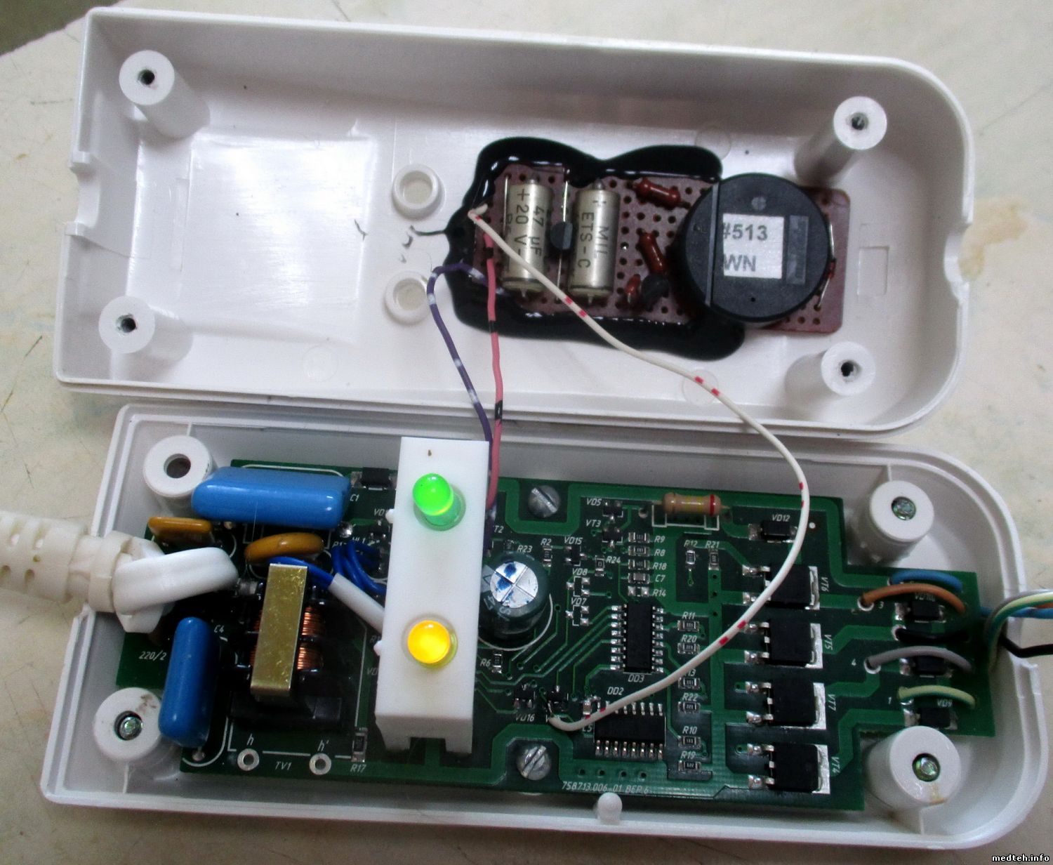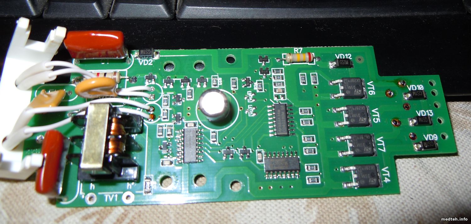Принесли прибор с такой проблемой: через минуту начинают "хандрить" индикаторы излучателей - неравномерно мигают, иногда пропадают на полсекунды. Ещё через три минуты излучатели отключаются совсем, на блоке горит только индикатор "Сеть". Если после этого прибор обесточить и сразу включить снова, то индикаторы излучателей начинают сразу "беситься", проходит две минуты и излучатели опять отключаются))