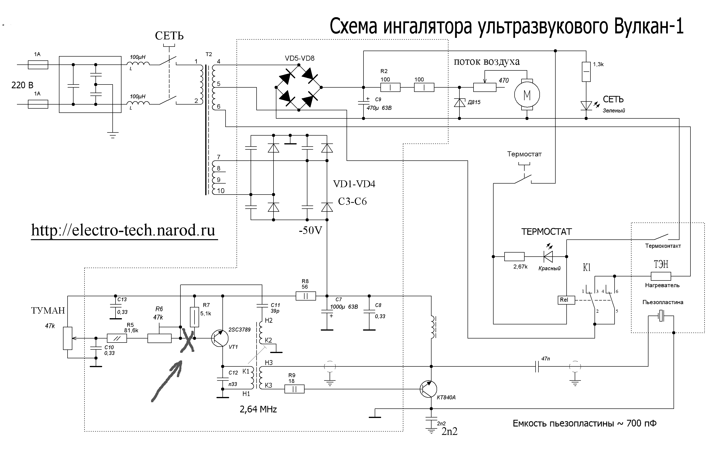 Товарищи, помогите! Ингалятор Вулкан-1, нет генерации. На VT1 на базе и эммитере -62,4В (такое напряжение идёт с выпрямителя), то есть смещения на базе нет, и нечего не меняется от вращения переменника. Транзисторы прозванивал и один и второй-всё в норме. Благодарю за Ваш ответ.