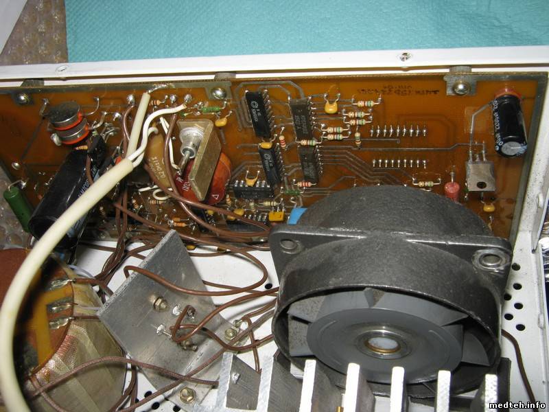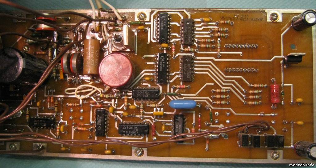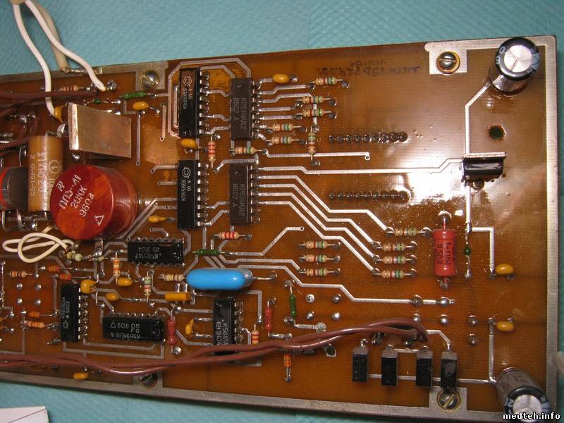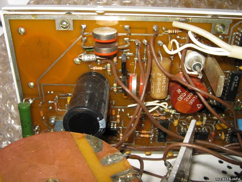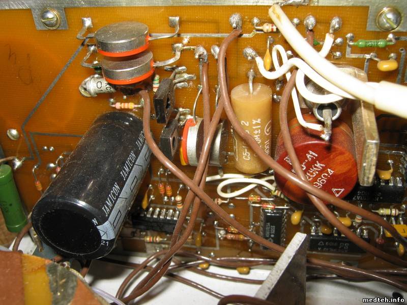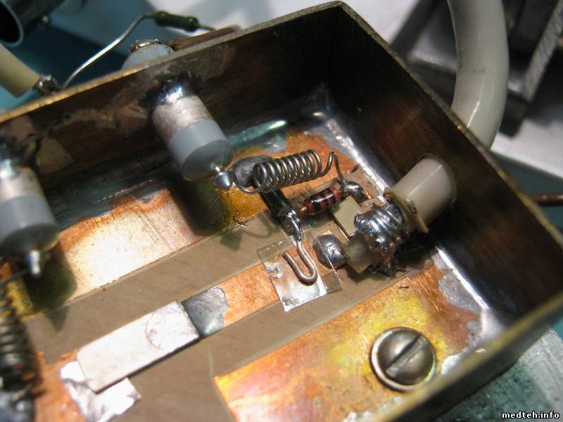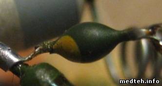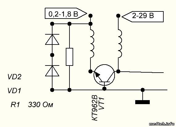 Напряжение база-эмиттер не может быть больше 4 в - транзистор помрет. Для[i] открытого состояния транзистора, достаточно в среднем ( в зависимости от тока коллектора!) 0.6-0.7 вольта. В схеме пост №25 на эмиттере не просто индуктивность а сопротивление! АВТОГЕНЕРАТОР! Питание тока базы производится стабилизатором тока, Напряжение на коллекторе импульсное и правильно заметил Петр от 2 до 26... вольт, скважность прямоугольного импульса меняется,. все остальные элементы Фильтр на полосковых резонаторах+ отвод через маленькую емкость, см. крючок на http://www.medteh.info/_fr/65/3796246.jpg пиковый вольтметр, смотрим напряжение выхода, повторяющее форму питания - служит обратной связью, и индикации неправильного расположения пациента. На данном выводе инфо о выходной мощности (паспортные зн. пожже приведу). Транзисторы выгорают чаще по причине отсутствия нагрузки, облома излишне коротких проводов индукторов и Банального статического заряда с пациента!! Мероприятия по ремонту с заменой транзистора, начинать с проверки 1)тока базы, косвенно скажем 12 вольтова я лампочка от бортовых поворотов авто , и на корпус - слегка светится. 2) есть регулировка напряжения коллектора 3) меняем полупроводник - выводы подрезать максимально, удобней ставить! и целостность остальных деталей 4) подключаем цифровой вольтметр (снаружи коробочки) на вывод контроля и Родную нагрузку!(у производителя ??? R=120 om без индуктивная!) ... ЕСли полупроводник обладает достаточным коэффициентом усиления видим напряжение !! Не бойтесь увести частоту выхода ворота +-91МгЦ ! определены полосковыми резонаторами Все! можно посмотреть значение Тока питания коллектора ( в разрыв провода) ! 1.2-1.4 ампера при хорошем транзисторе!