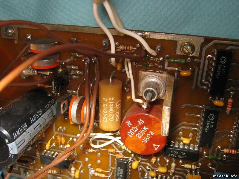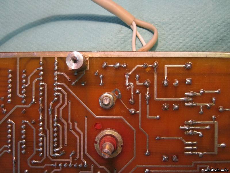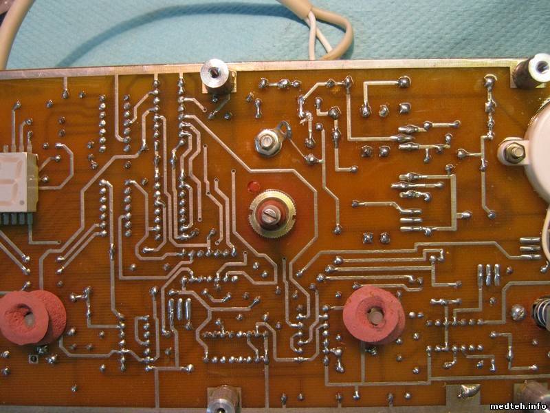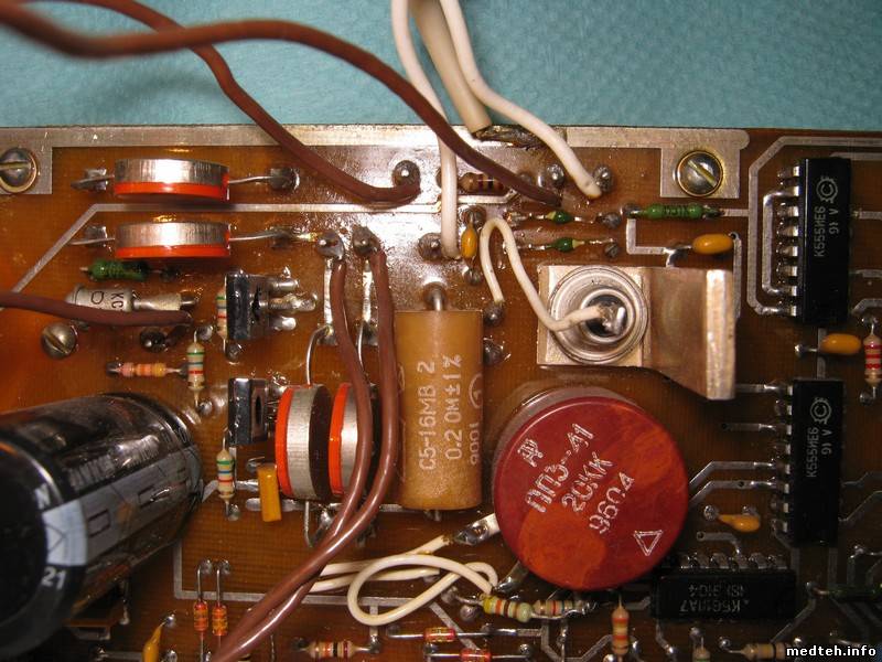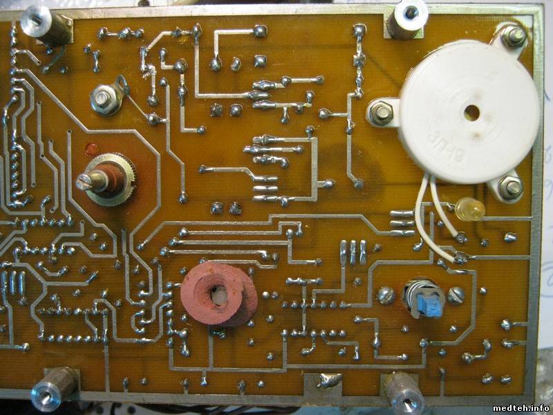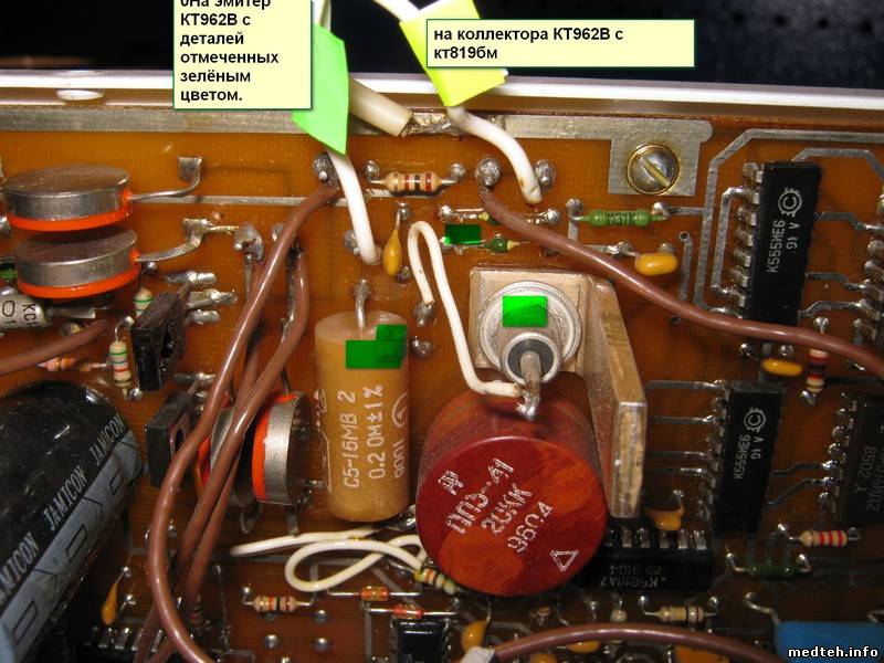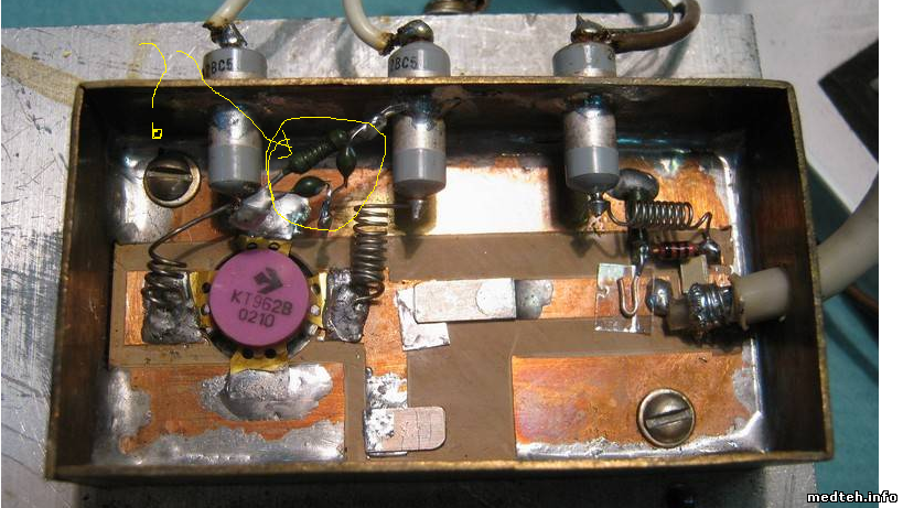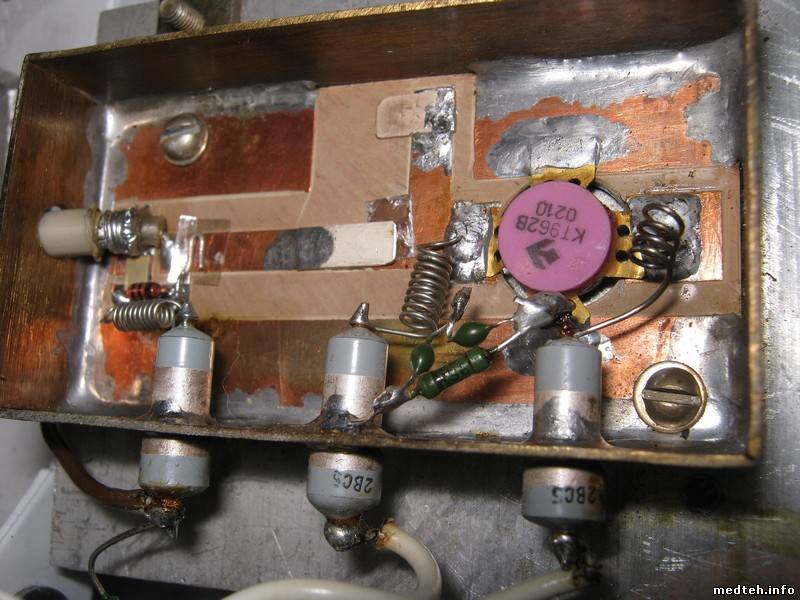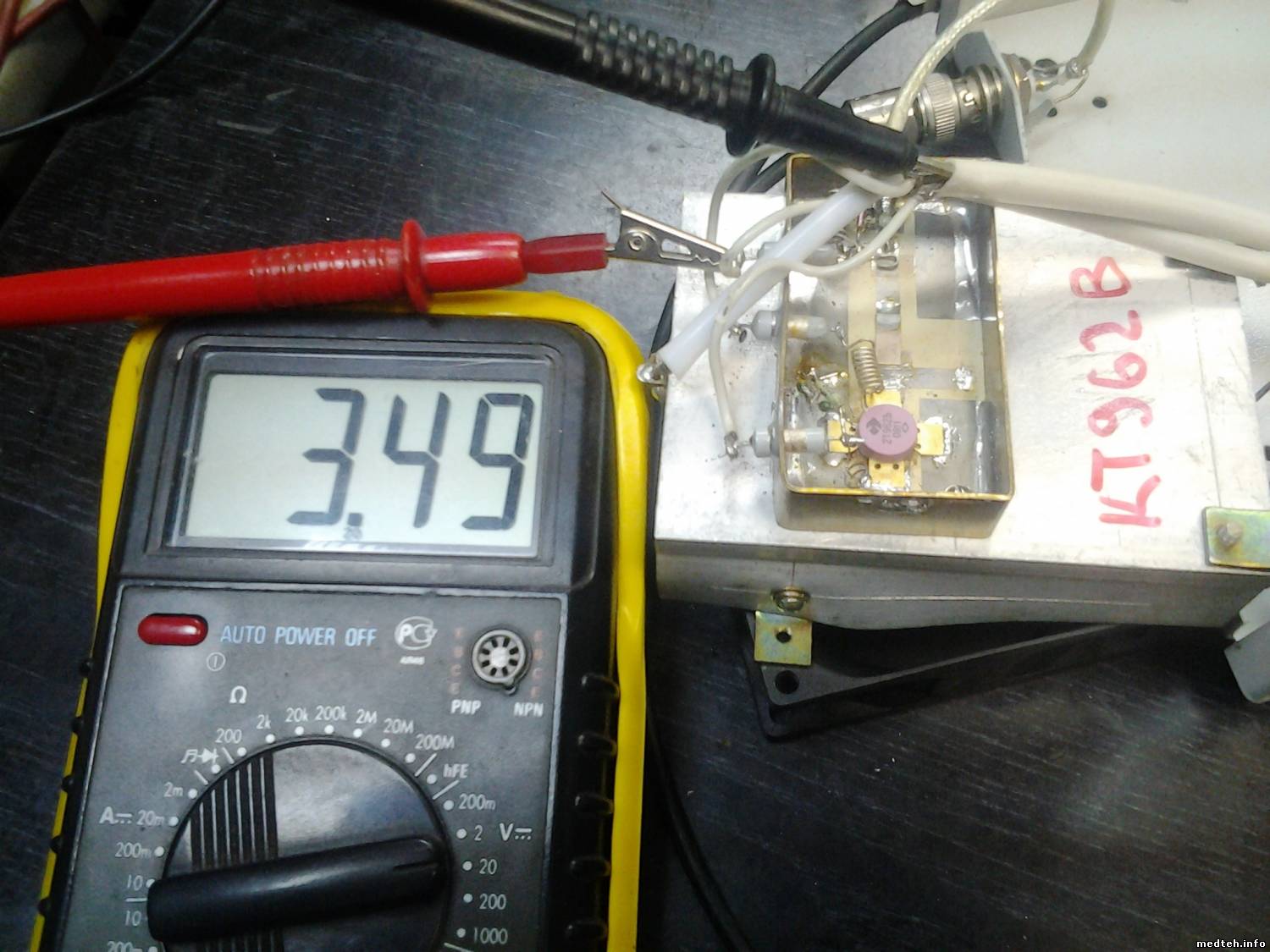 Добрый день всем. Аппарат ДМВ-терапии , без индикатора выходной мощности.Не пойму как понять ,что он выдаёт излучение согласно установленного ручкой регулировки. Плата генератора. На ней только один транзистор КТ962В. При включении питания прибора напряжение Б-К -0 Вольт. Б-Э -0 Вольт. При нажатии кнопки пуск, после включения таймера появляется напряжение на коллекторе 0,2 вольта ,а на эмиттере 2 Вольта. Ручкой регулировки мощности можно изменять напряжение на коллекторе с 0,2 В до 1,8 В. А на Эмиттере меняется с 2 вольт до 29 вольт. Диоды я поменял на КД 103 А. Прежние два диода были в коротком замыкании. Транзистор КТ 962 В получается имеет две базы и они обе на корпусе прибора. Видимо это автогенератор. И генерация происходит только в нём. Но генерации нет. Излучателя у меня нет. Подключаю нагрузку 50 Ом.