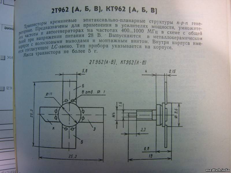 Spektron46, - КТ962 предназначен для работы в схемах усилителях мощности класса С, умножителях частоты и автогенераторах на частотах 400-1000 МГц при напряжении питания 28 В внутри корпуса имеется согласующее LC-звено. Эти транзисторы изначально проектировались для работы на рассогласованную нагрузку.