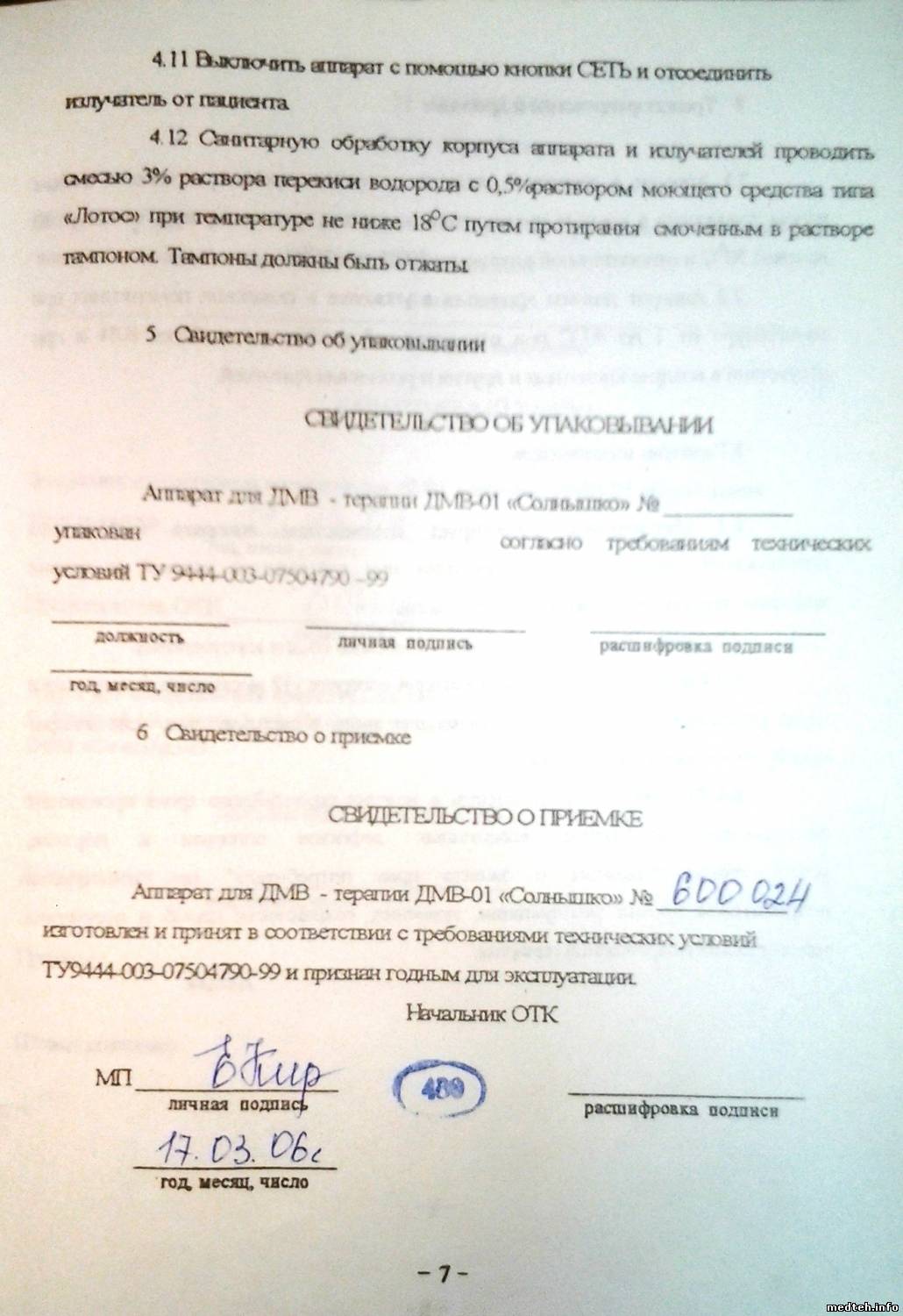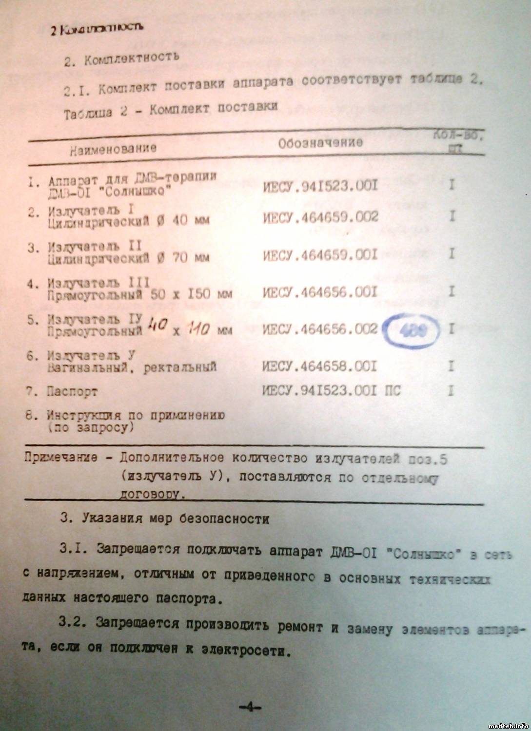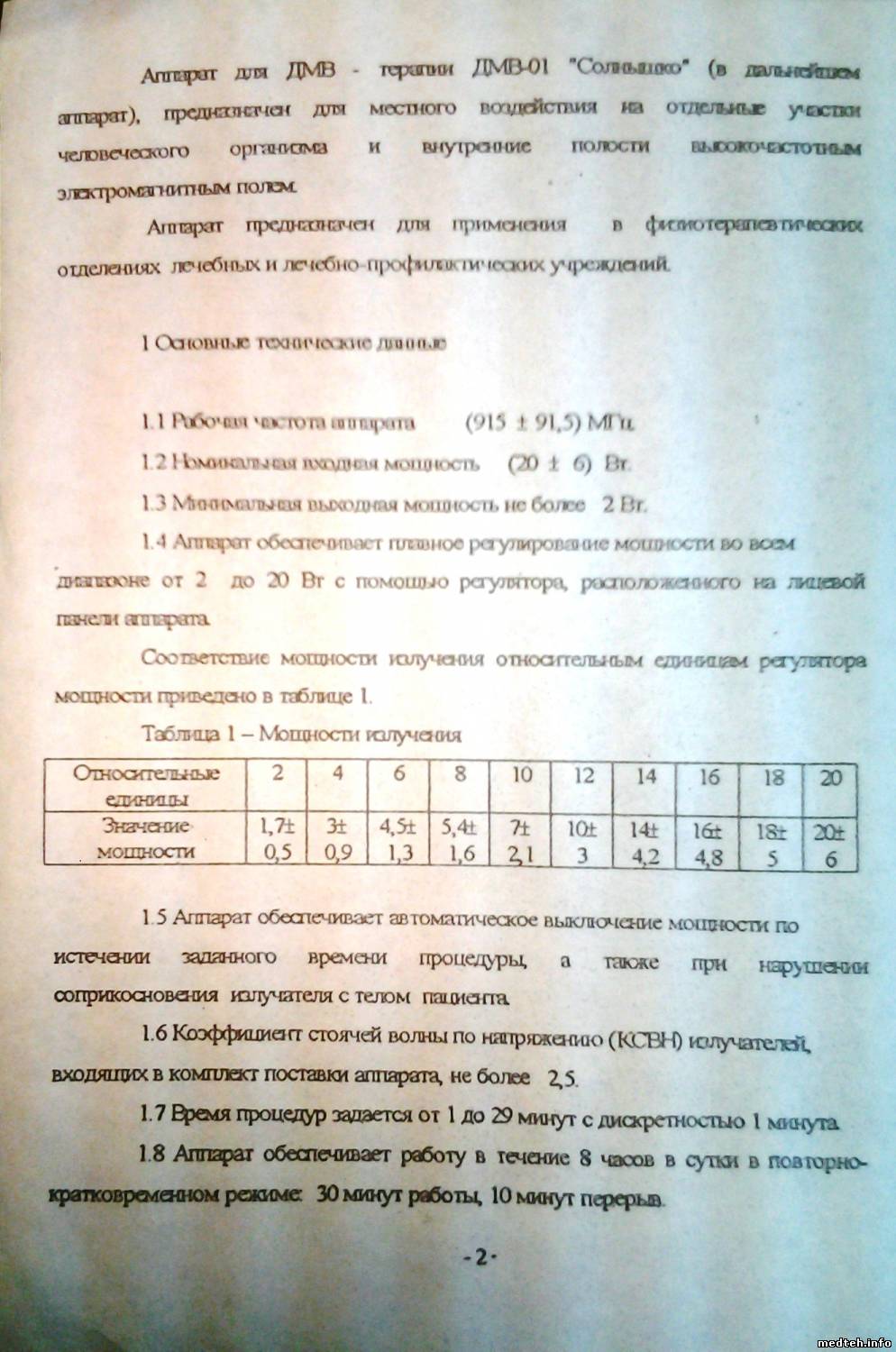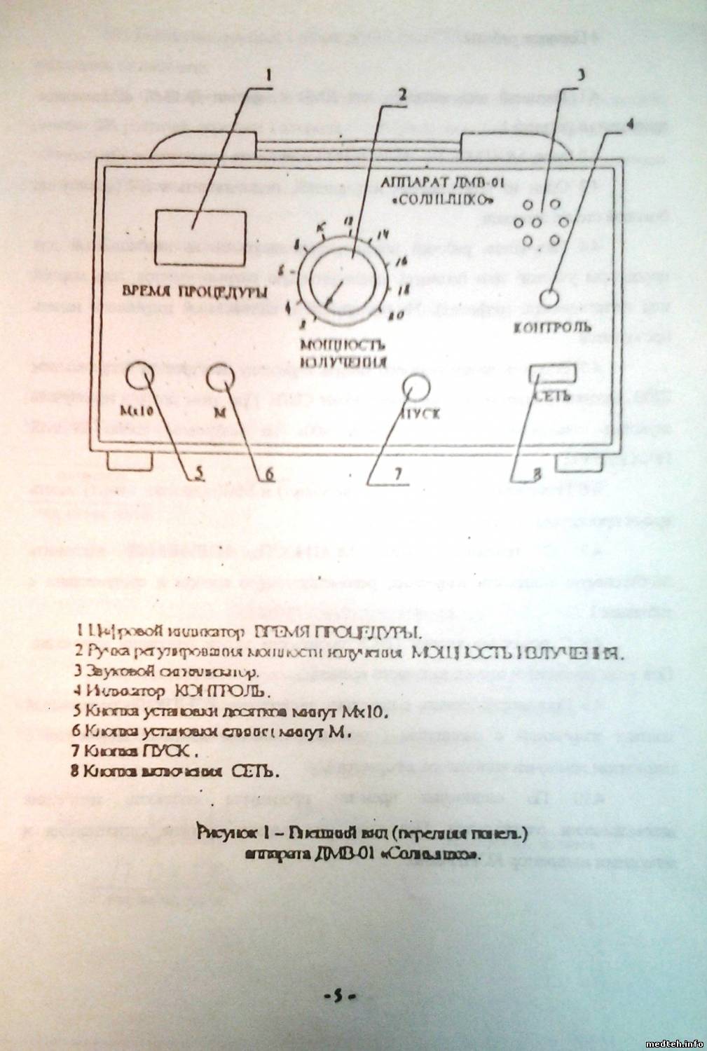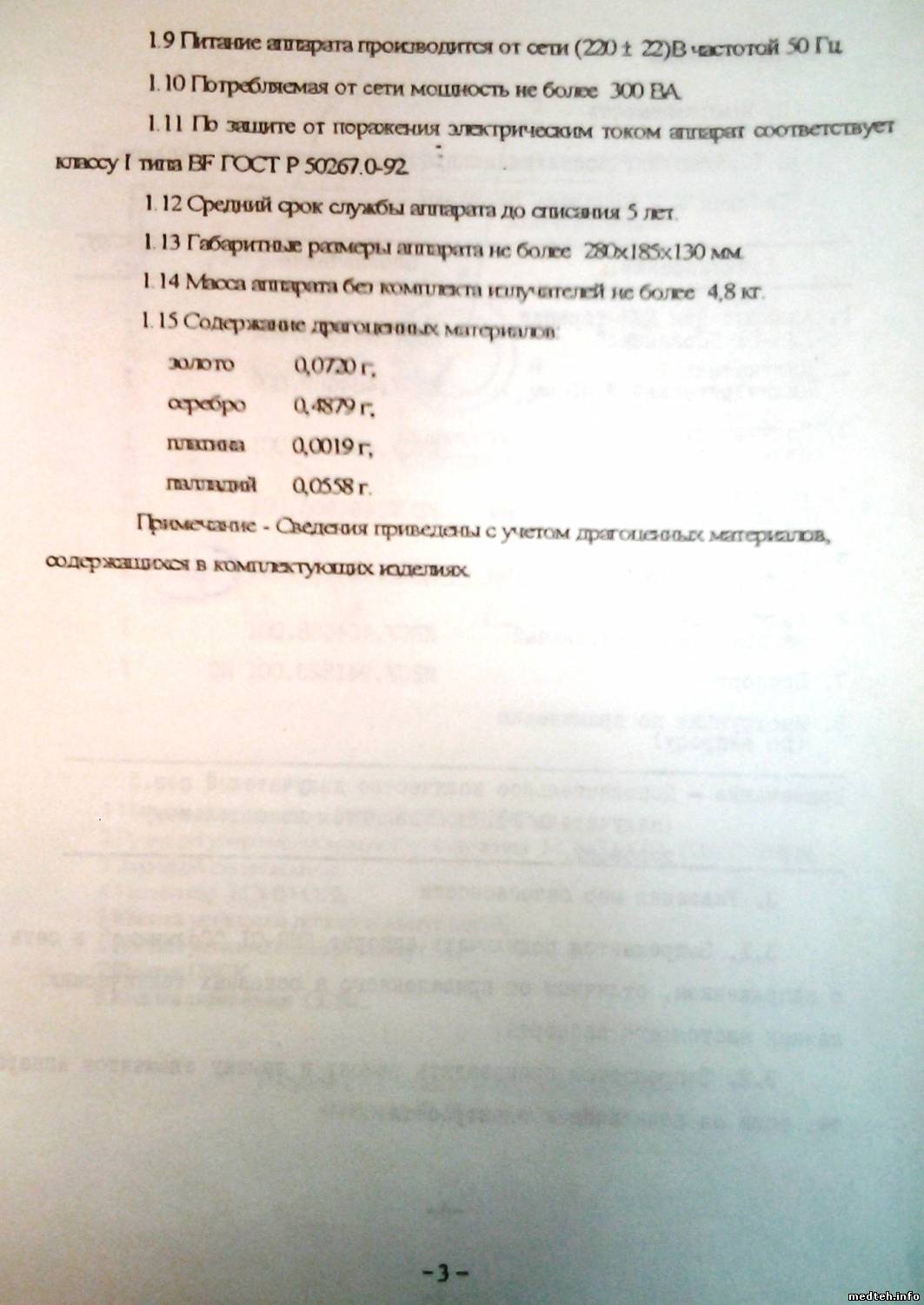 Аппарат обеспечивает автоматическое снятие мощности излучения по истечении заданного времени процедуры, а также при нарушении соприкосновения излучателя с телом пациента."