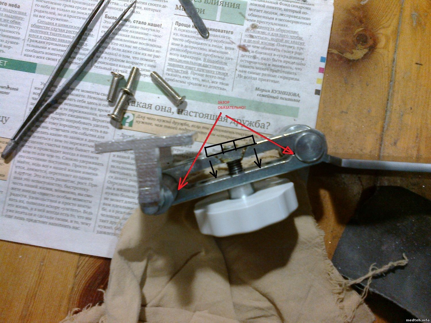 то увеличить зазор. Я прелагал перевернуть гайку, чтобы она сильнее нажимала, а не шла в распор, (отмечено чёрным).