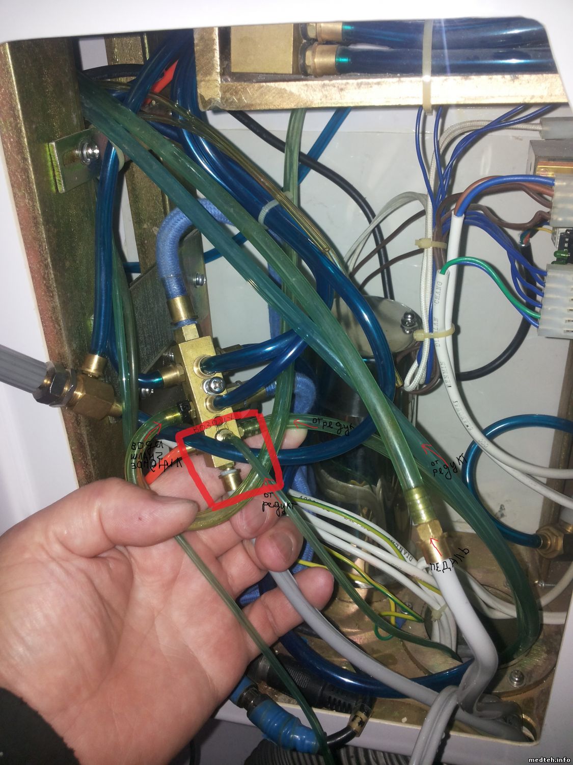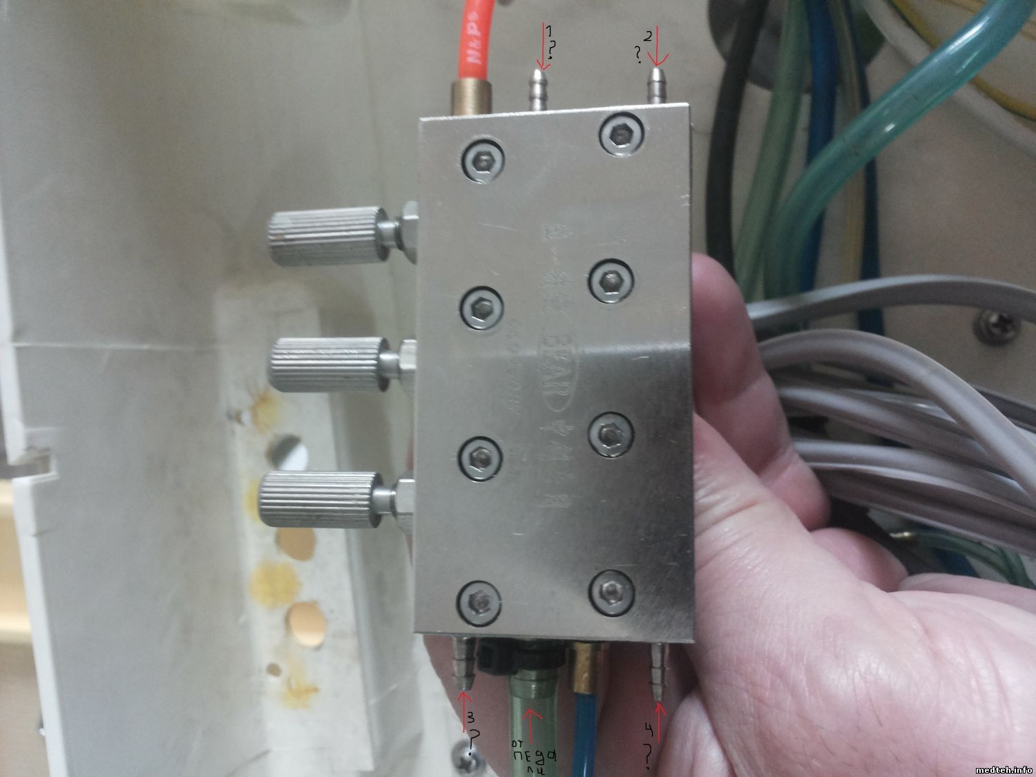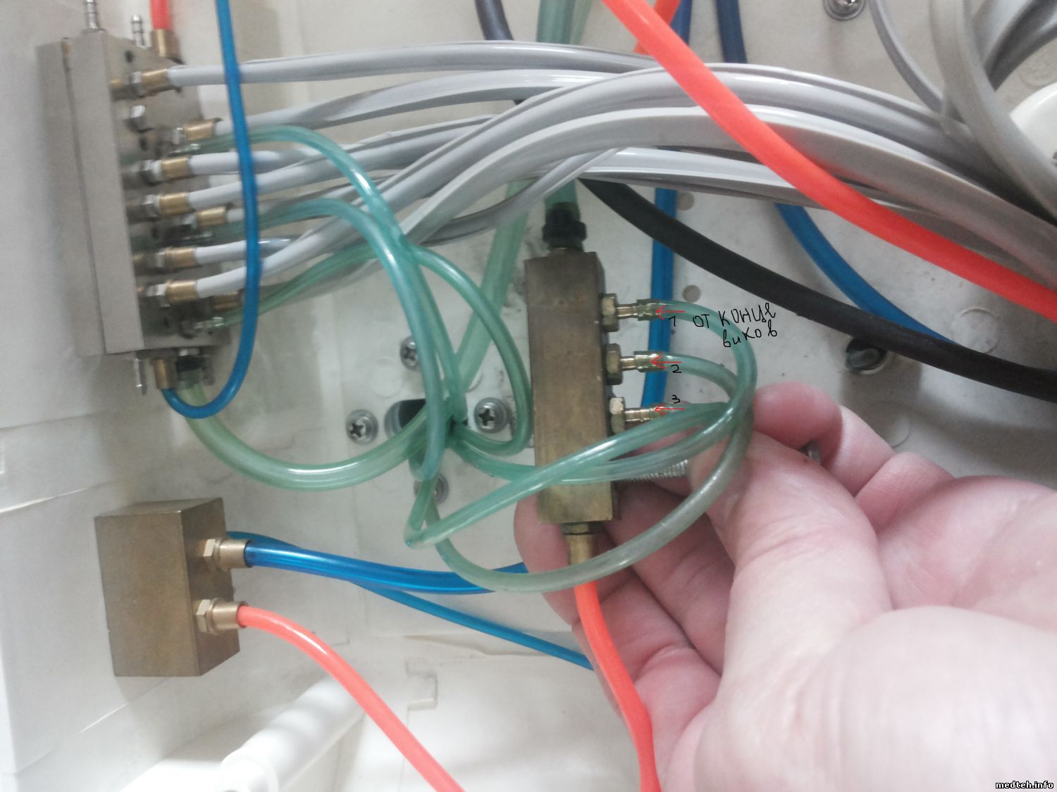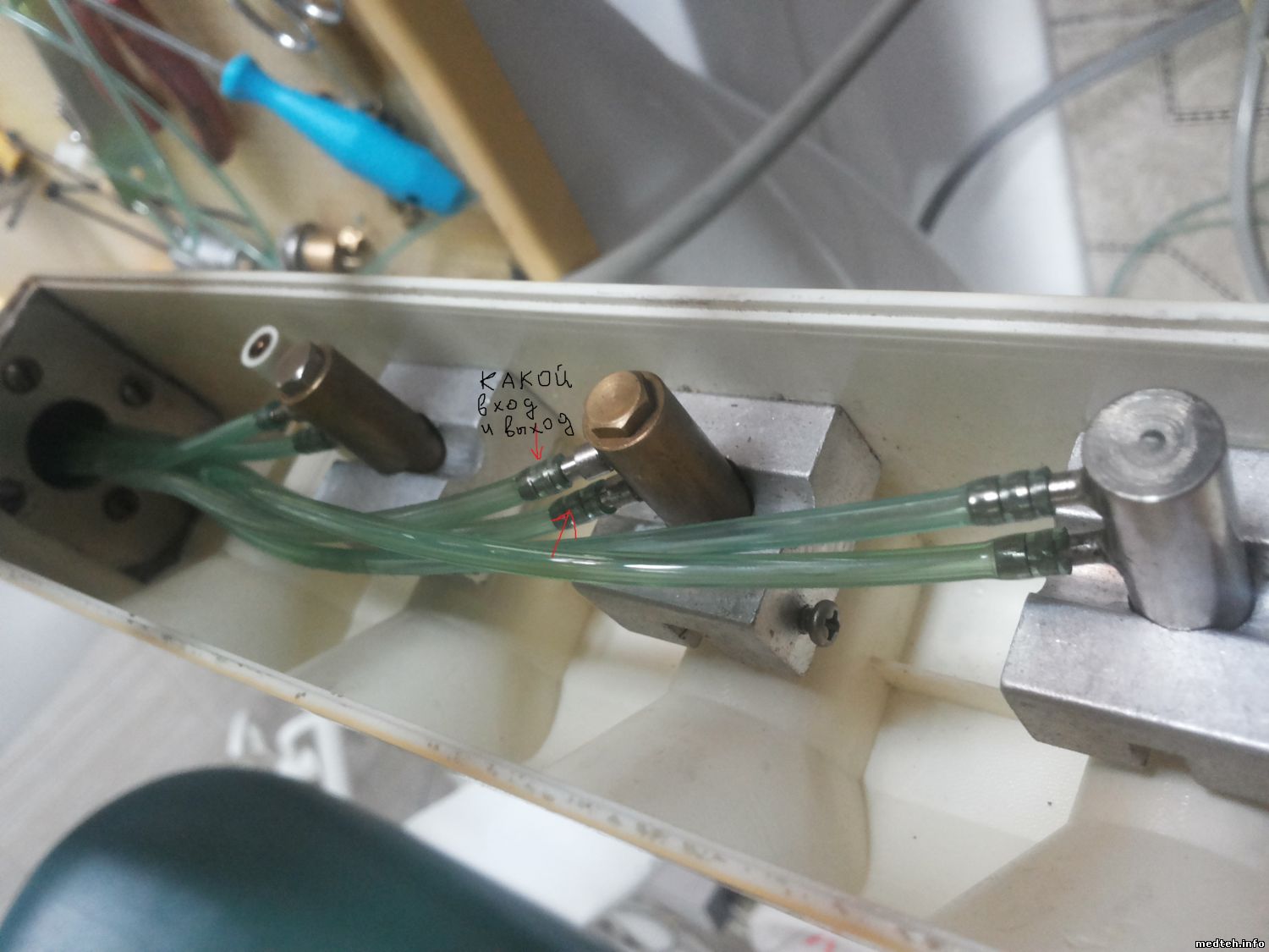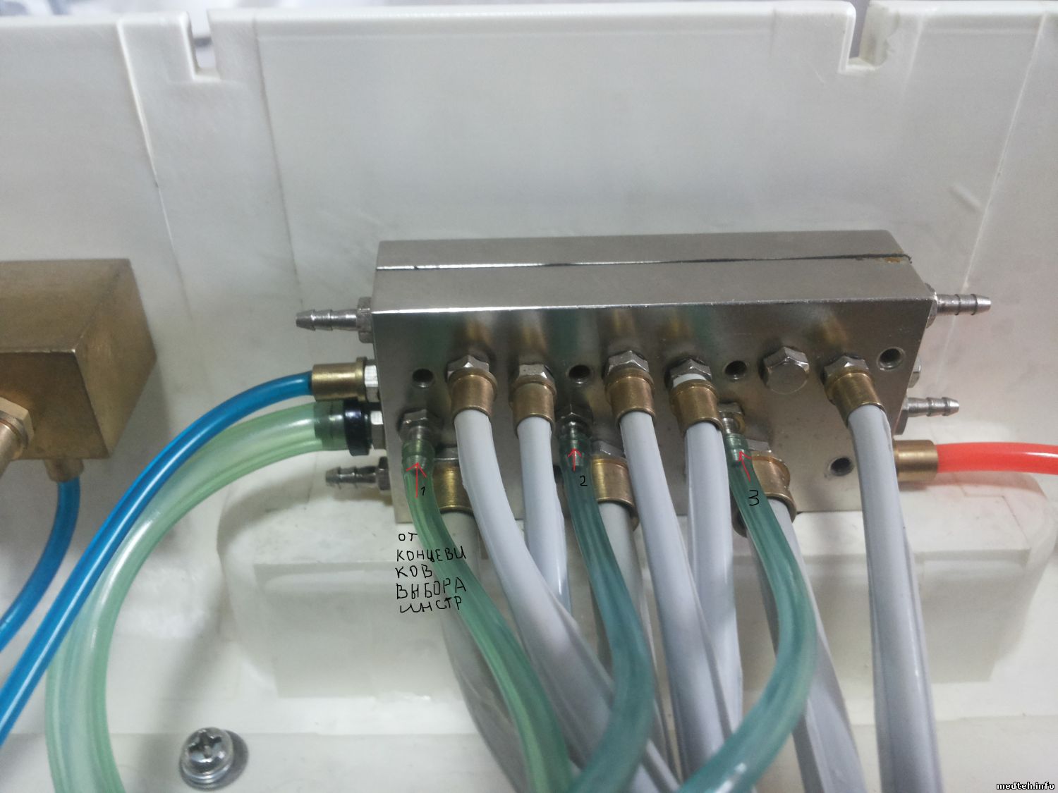 dantist95, при снятии инструмента должен быть характерный "пшик", т.е. сброс запирающего воздуха на гребёнку. Что же касается вопроса по фото 7240536.jpg, то это клапан воды и на его свободный штуцер подаётся управляющий воздух от педали для включения воды.