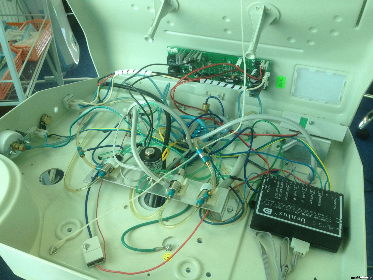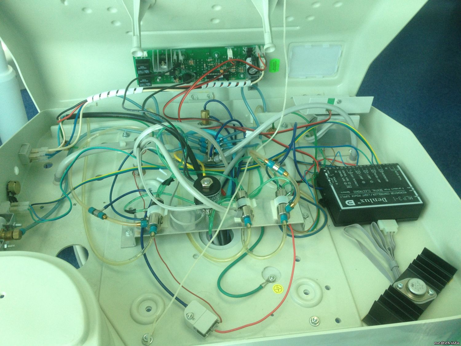 это не так . тот клапан от системы дезинфекции шлангов ( есть и такое у гнатусов) , убрать его . если клапан открыт , то течёт из всех шлангов жидкость из бутылки с жёлтой наклейкой по жёлтому шлангу, без поднятия шлангов и нажатия на педаль. в данном случае просто не возвращается поршень в клапане . лечится регулярным использованием , но всё равно здыхает. выход - поставить на каждый шланг китайский клапан.