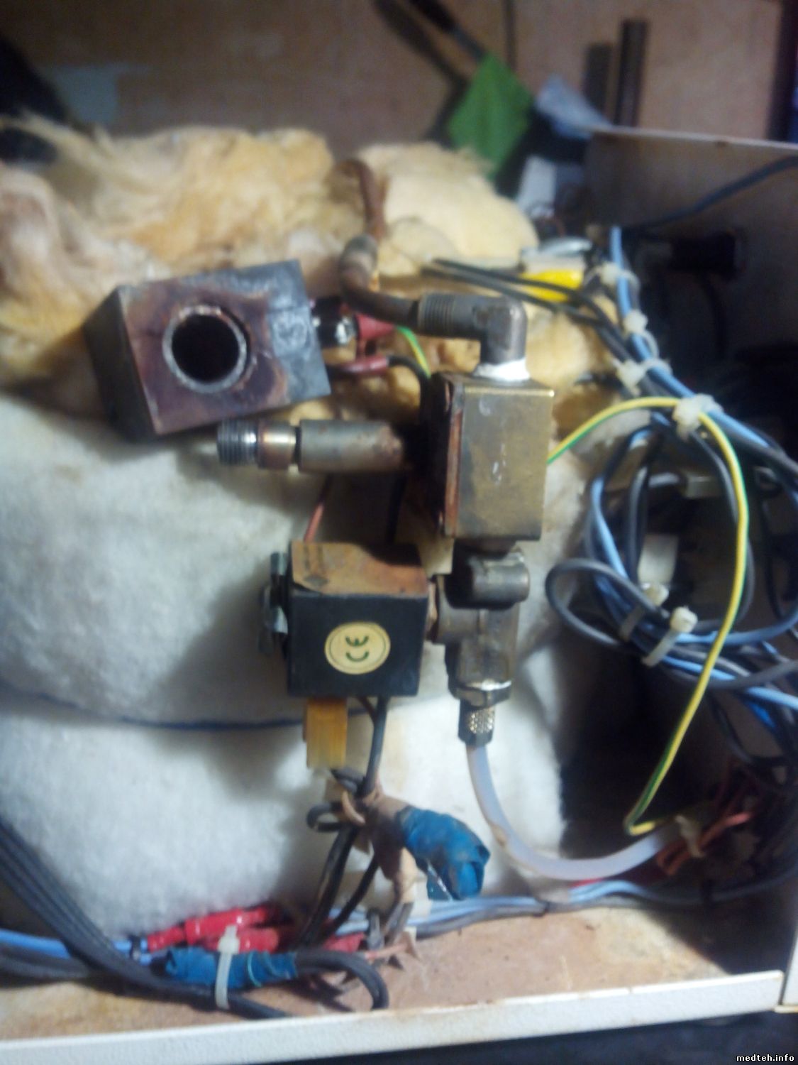 "ИМПОТЕНТ" особенно БЛАГОДАРЕН !!!,за то ,что вы меня направили на путь истинный,своим вопросом ,нахрена там два клапана ??? !!!!!!!,размотал все сопли и ...не поверите дурню старому ,.... обнаружил что два клапана соединены последовательно ,один на 24 v,второй 220v,понятно что первый не горит первым и будет работать пока не сгорит на 220v(это если правильно предполагаю ,как включать в сеть перемотанный транс-р,слампочкой ?),что и произошло ,клапан на 220v ,поддтекал,ремонтировался ,не раз похоже заменой кольцевой прокладки +герметик,катушка проржавела ,и что самое смешное,вернее даже не очень смешное,! Сухая работала,не много намокнет ,не работает,но и самое не смешное,включение катушек (разрыв питания),было подано на металлическую педаль ножную включения ,а это скока вольт- ?,есть кто то ,кто помнит физику без ГУГЛА,думаю вольт 200минимум,при сети 220в или как ? Причиной неисправности изначально была сгоревшая первичка транса(поэтому предыдущий "МАСТЕР"-медтехник и придумал такой ход ,причём выбросил все родные соединения,всё посадил на медь ,как в холодилках) ,видно попала влага с внутреннего крана на полдюйма, с жопы аппарата ,он стоит как раз над трансом . Всё восстановлено примерно как с завода . [p.s.]Приезжайте в гости с меня пи ВОД? сик !!!!