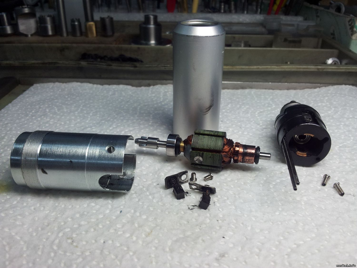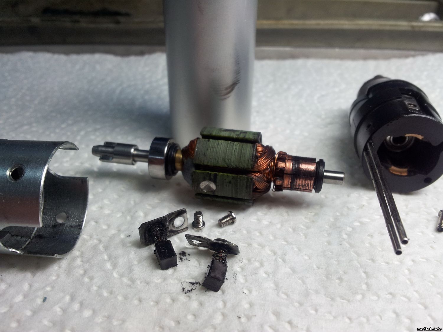 Уважаемые коллеги, прошу помощи, отдали в ремонт микроэлектромотор MicroNX мод. NX-HW100, жалобы на падение мощности при работе, микроэлектромотор щёточный, снял верхнюю часть, можно вытащить передний подшипник, но дальше никак, внутренняя часть вращается в кожухе, попробовал сдернуть кожух, не идет, дополнительных винтов и стопоров не вижу.