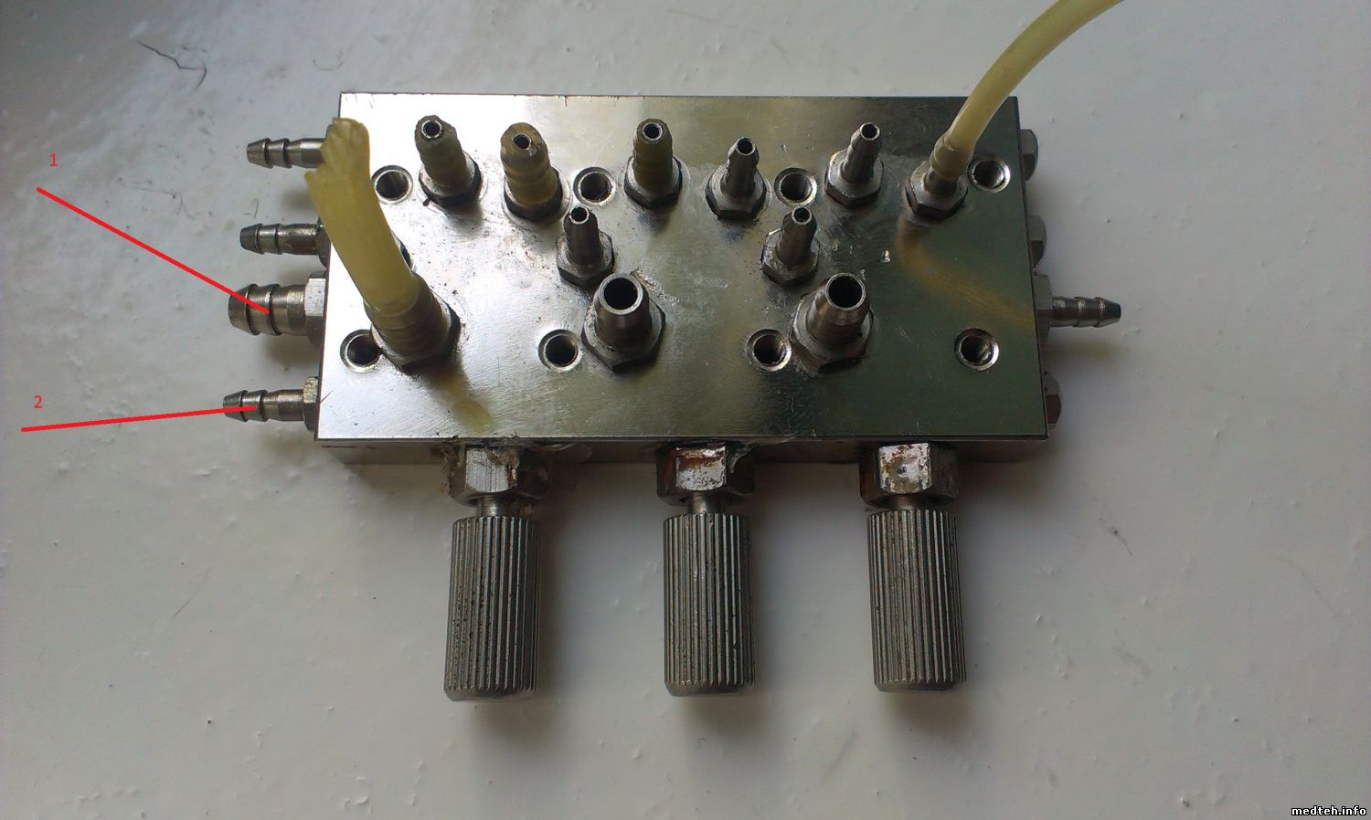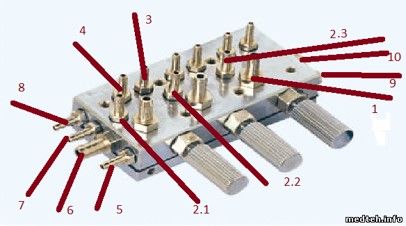 нашел множество мест продажи и описание выводов похожих клапанов, но не этого. Я так понимаю 2.1-2.3 управление, открывающие давление при снятии соответствующего инструмента. 1 - подача сжатого воздуха на инструмент. 3 и 4 это подача воды, но почему их 2, вход и выход? и ка определить где вход и выход. 6- воздух с компресора. а вот 5,7,8,9,10 не понимаю зачем нужны. предположительно один должен идти на воду другой на датчик давления, а куда идет еще 3?