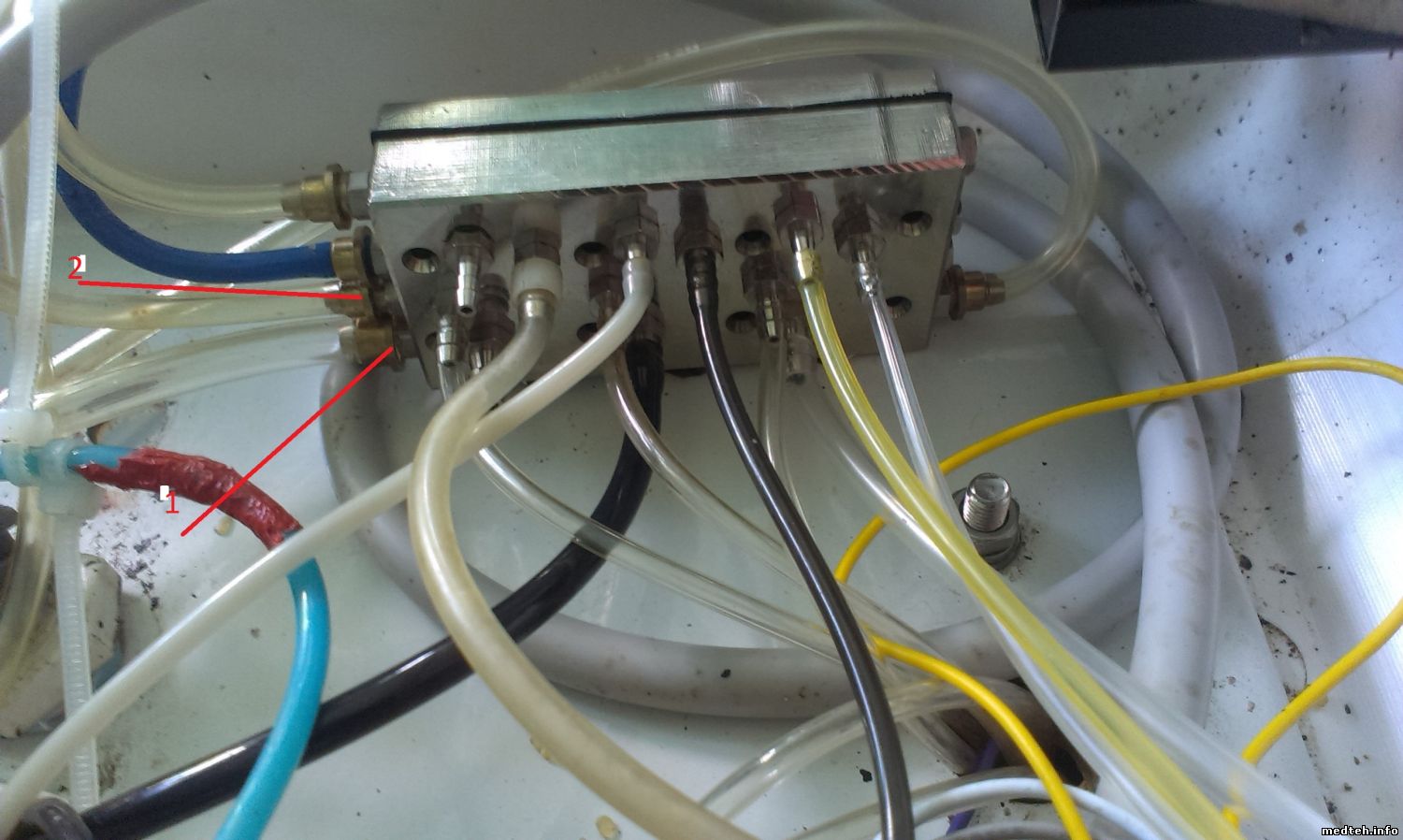 3) в шлангах подключения инструмента 4 трубки. 1 трубка широкая идет на подачу воздуха, и присоединяется к выводу 1 rs112. 2 тоненькие трубки идут на воду? на 3 и 4 RS112? а вторая широка трубка куда идет, и куда ее подсоединять в установке, если на выхода в мембранном клапане 3шт.?