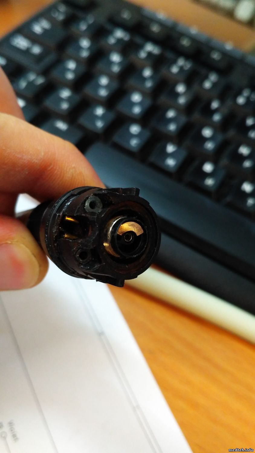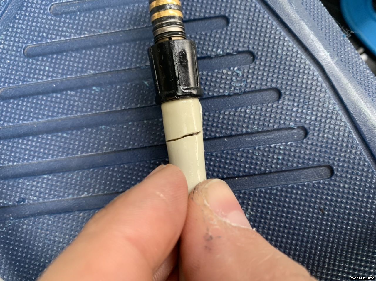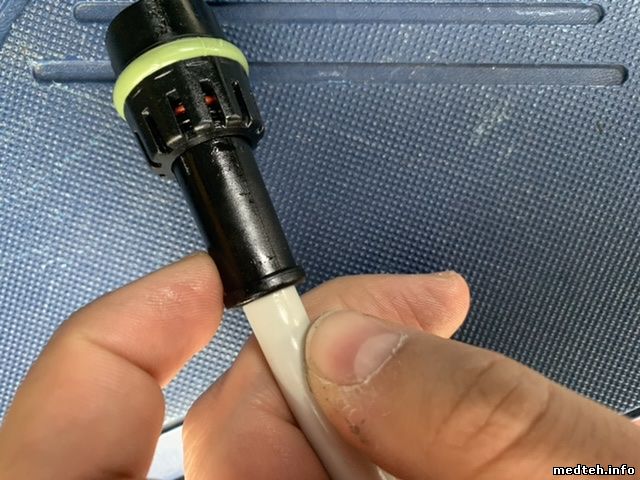 Всем доброго времени суток! Столкнулся с такой проблемой, что провода внутри шланга оборвались, но ни разу не разбирал их. Подскажите, они разборные вообще или сделаны намертво. С одной стороны он спокойно достаётся (место соединения со столиком врача), а вот с другой стороны непонятно как разобрать. Светодиод вытащил, а вот что далее делать - не представляю.