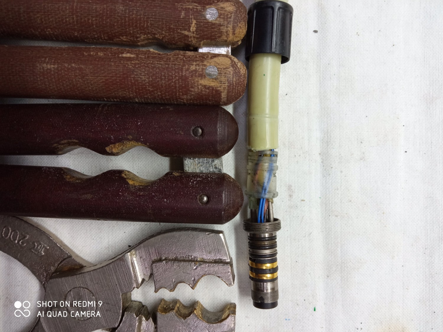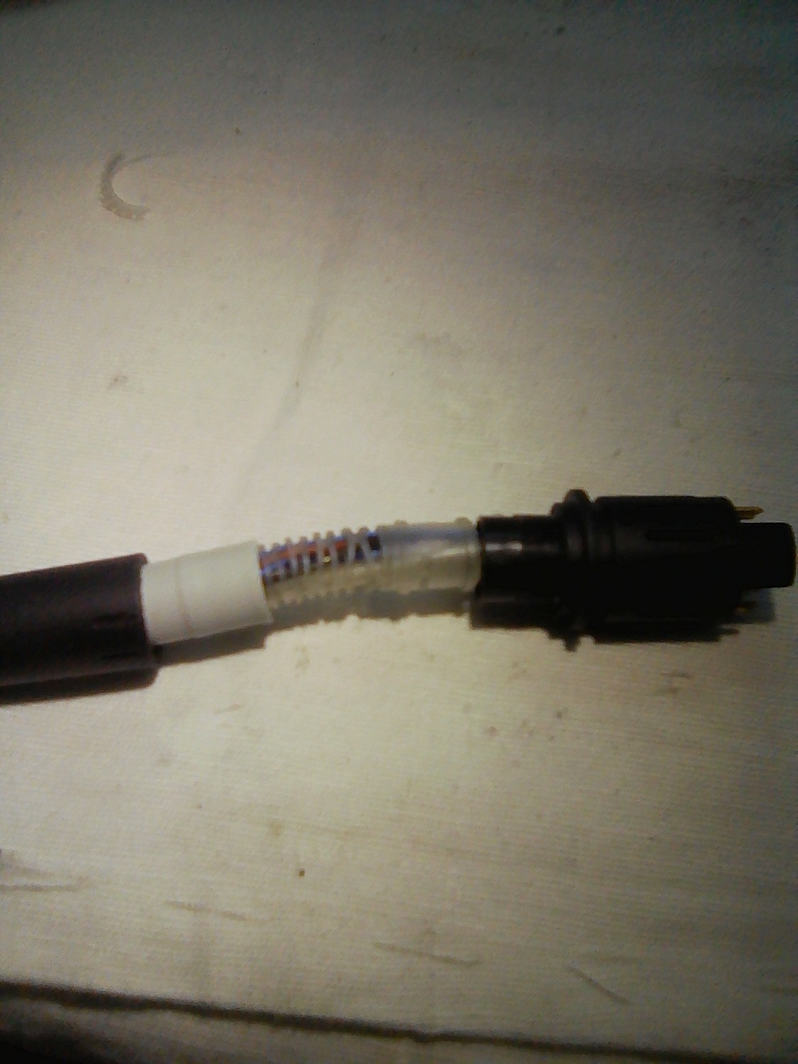 Здесь, в принципе, тоже самое - откручивается чёрная пластмассовая (иногда латунная анодированная) гайка. Если проблема только в порванной оболочке, решается просто по общепринятой методике. Единственное, надо будет укоротить подводящие шланги соответственно длине укороченной оболочки (они весьма жёсткие и появляется вероятность их перелома или "топорщения" внутри собранного шланга). Ну, а если требуется менять провода, то увы, даже при надлежащих навыках восстановить их до заводского состояния со стороны мотора практически невозможно. Следует заметить, что и при разборке, и при сборке нельзя допускать вращения оболочки вместе с гайкой. Инструмент и материалы: текстолитовые щипцы или тиски с закруглёнными мягкими губками, латунные пассатижи, маленькие острые ножницы, канцелярский нож, чистый бензин, силиконовое масло, матерчатые перчатки. Может быть, фен, но без фанатизма. Пришлось разобрать рабочий шланг, но не беда: