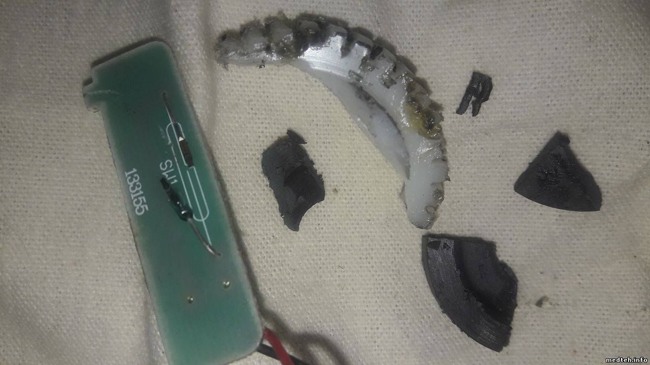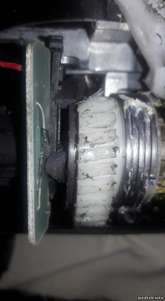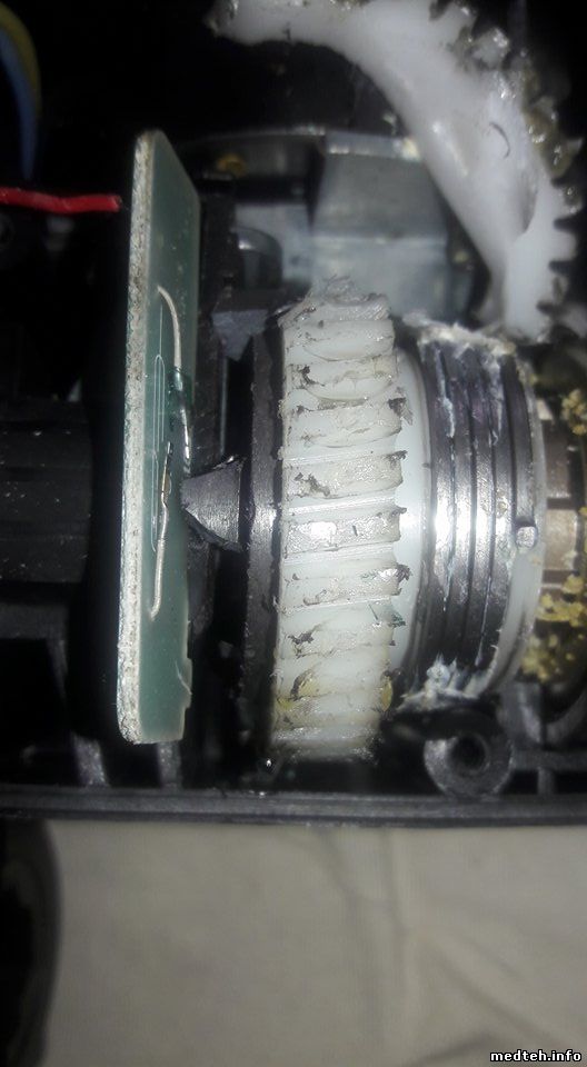 Подозреваю, что отвалился кусок шестерни (возможно,первым разломался магнит) и начал крушить все на своем пути места ведь там свободного нет и ему некуда было деваться. Кусочки магнита я чуть ли не выбивал.