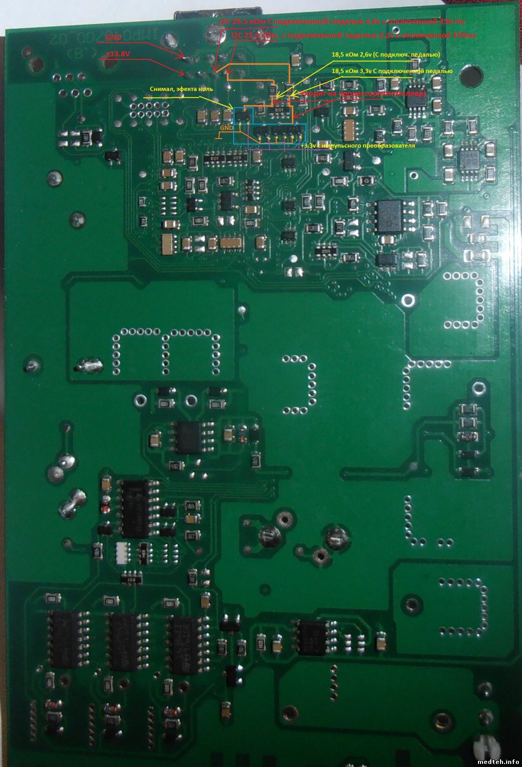 Всем доброе время суток. Столкнулся с такой засадой, физиодиспенсер Implantmed SI-923 фирмы W&H Dentalwerk Burmoos GmbH, Австрия, не видит педаль (на дисплее индицируется - Err09, что означает - не подключена педаль). Педаль общается по I2C шине (схемы нет, поэтому это моё предположение). Что было проделано: 1) Прозвонил контакты от разъёма до процессора (контроллера) - обе линии доходят. На линиях одинаковое сопротивление 27 кОм (на фото все замеры); 2) Варисторы (защитные диоды) скидывал - результата нет; 3) Вставал осцилом на линии данных - на одной сигнал есть, на второй тишина ...