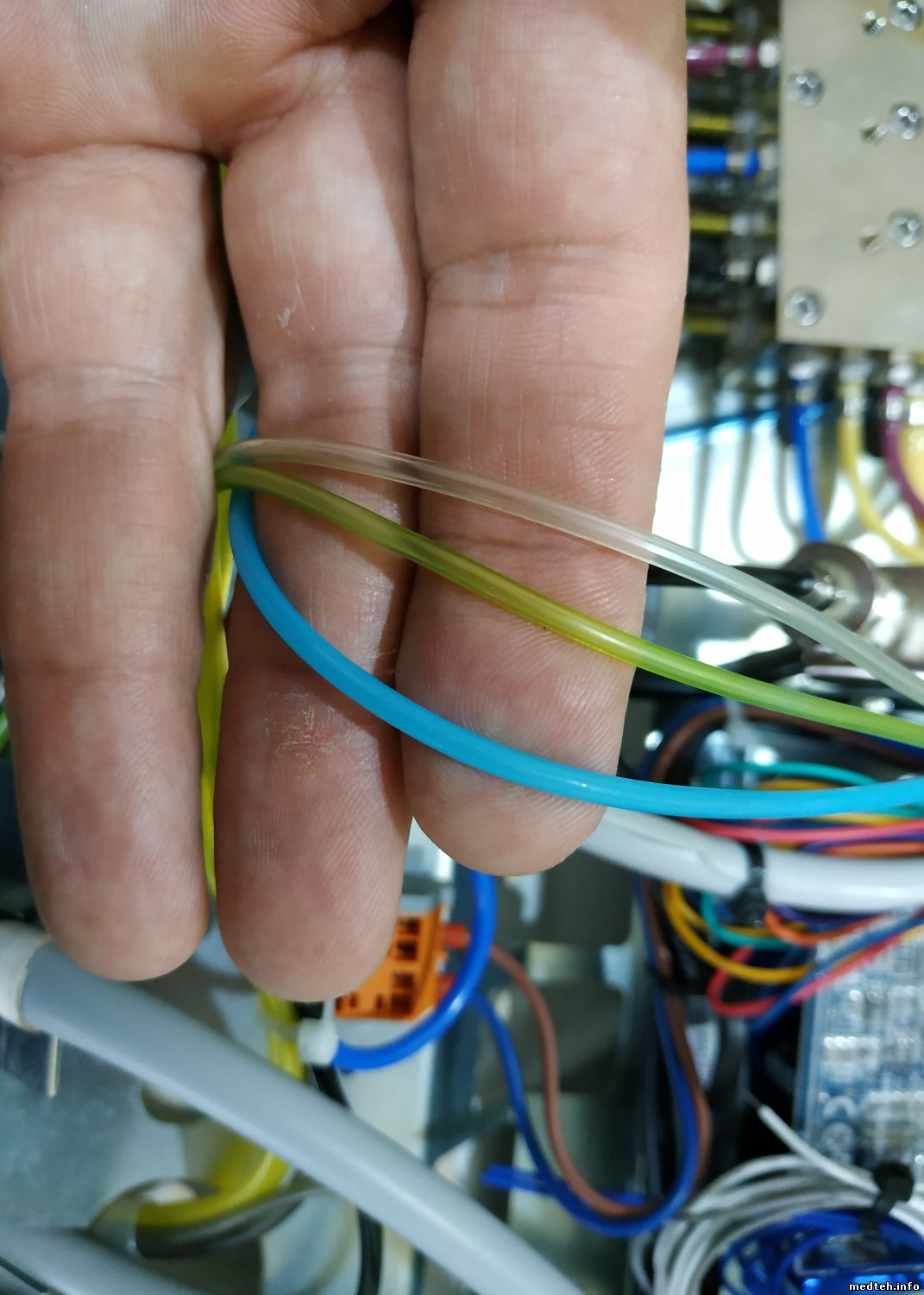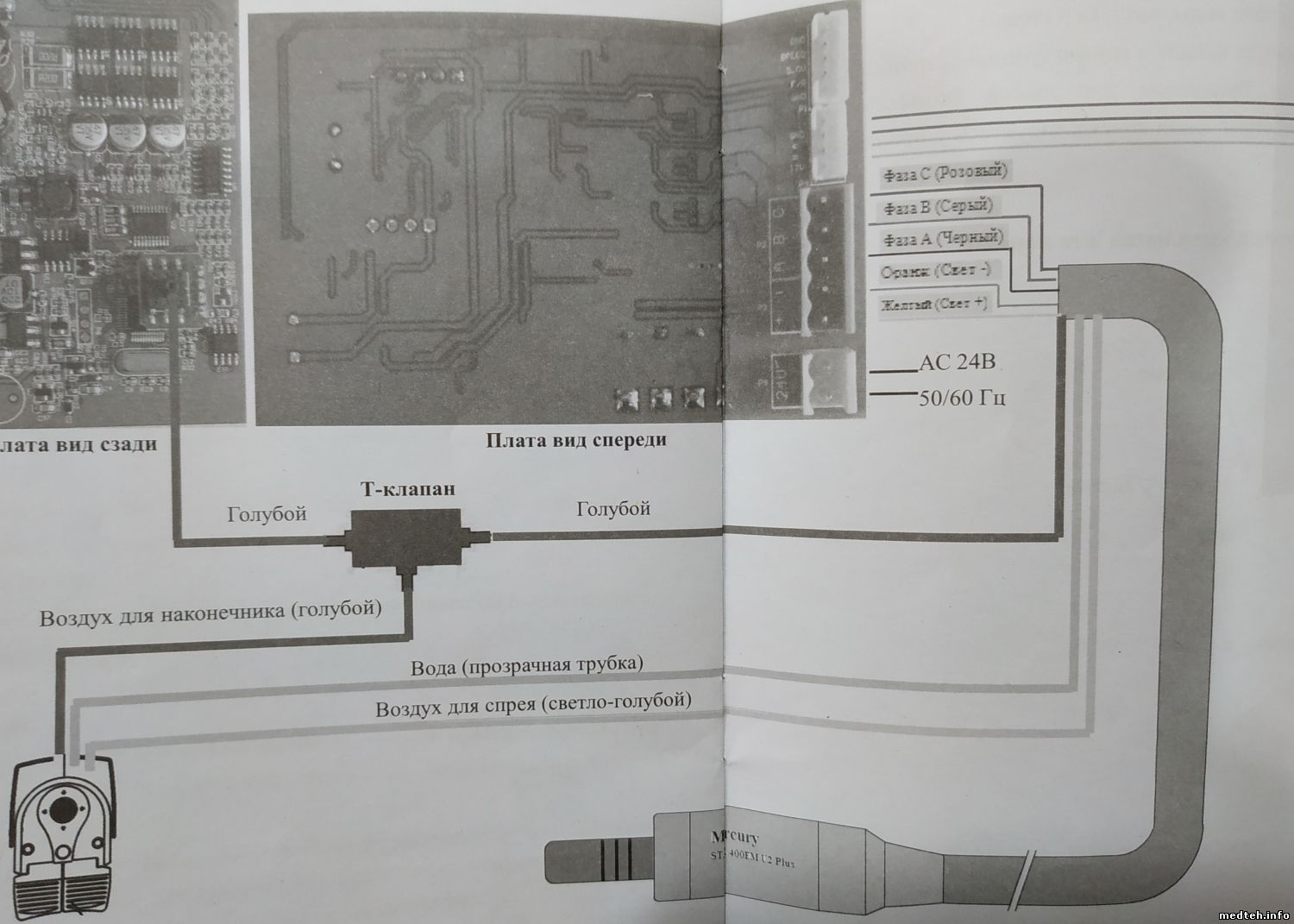 Доброго времени суток. Приобрели микромотор Mercury Star 400em U2 plus. При монтаже выяснилось несовпадение цветов трубок на шланге с цветами на схеме монтажа в инструкции. (все трубки на шланге одного диаметра: - голубой, прозрачный, желтый. На схеме: - голубой, прозрачный, светло-голубой) ... Подскажите, пожалуйста, может кто в курсе, как подключить шланг?
