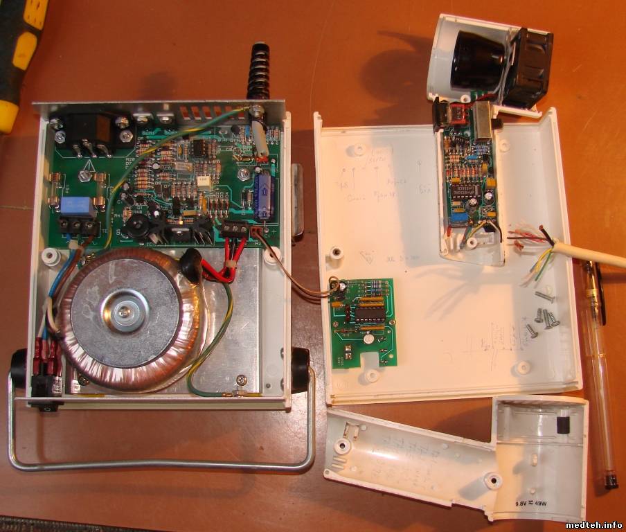 переломался кабель между блоком питания и "пистолетом". Умельцы брались заменить. Что там было сложного - не знаю, но ни кабеля нет, ни его огрызков. Может у кого есть хоть фото внутренностей, чтоб видеть, какого цвета провод куда припаян.