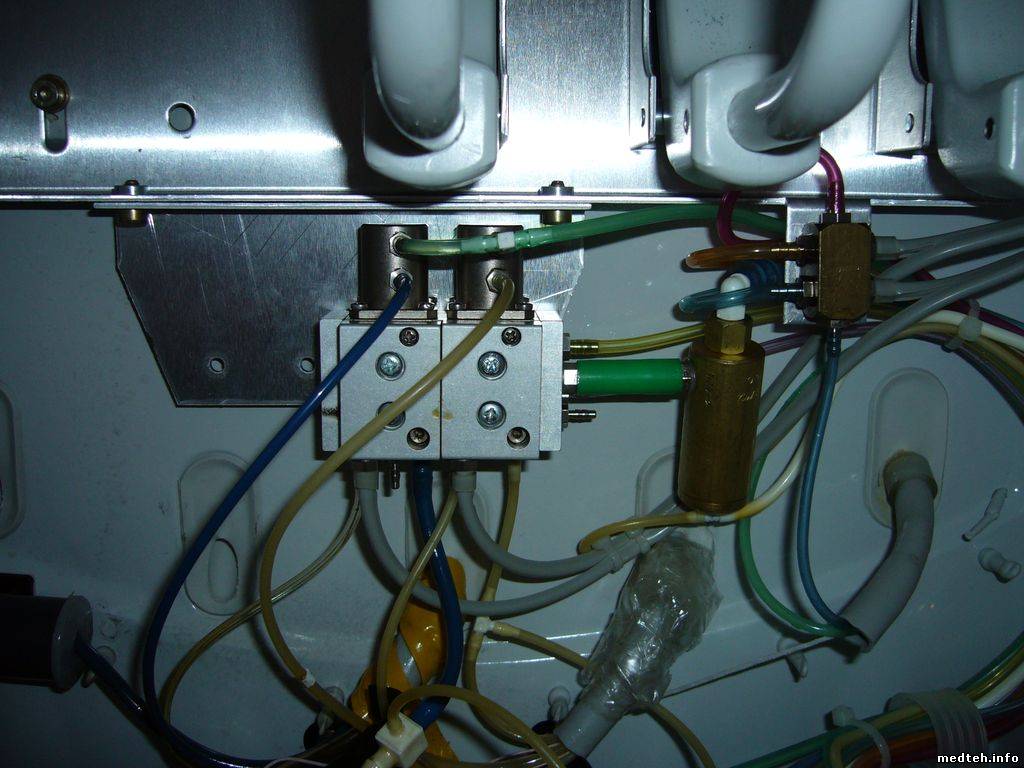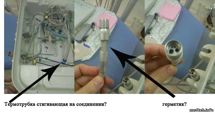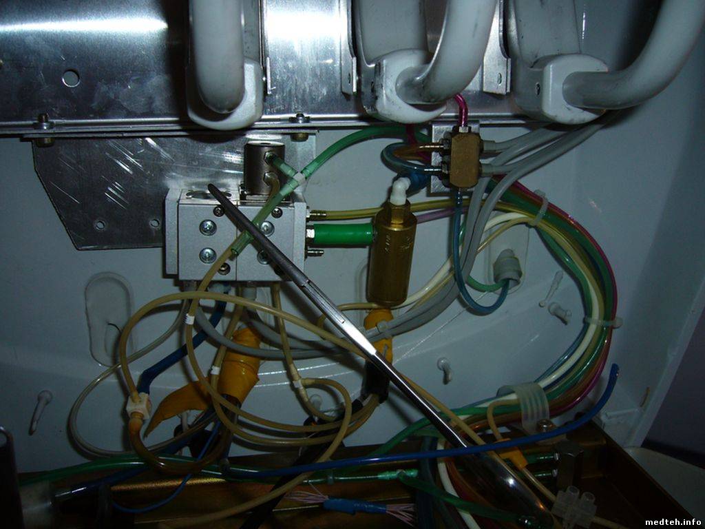 На втором шланге электрический мм ? А на него вода идёт? Отсутствует открывающий воду узел.по идее из места где он стоял при нажатии на педаль в режиме с водой должен дуть воздух.если нет то этот шланг гдето тоже загнули.это должен быть тонкий жёлтый шланг около толстого зелённого шланга.если мм врач с водой не использует, то можно перекинуть, а дырку закрыть чтобы не дуло.
