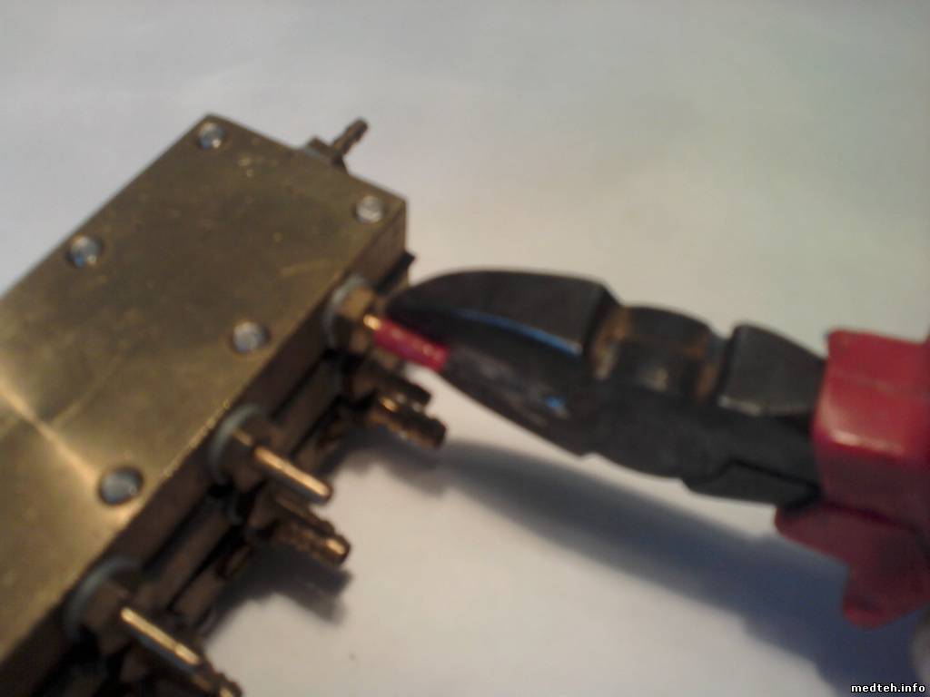при снятии шлангов со штуцеров нельзя сдёргивать шланг, и тем более зажав его кусачками снимать его вбок. штуцеры легко ломаются , а ещё некоторые производители клеют штуцеры эпоксидкой ( гнатус , олсен и т.п. - ) надо откусить шланг под штуцером, и остаток скусить со штуцера кусачками . кусачки у мастера должны разрезать тонкую клеёнку !