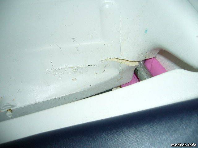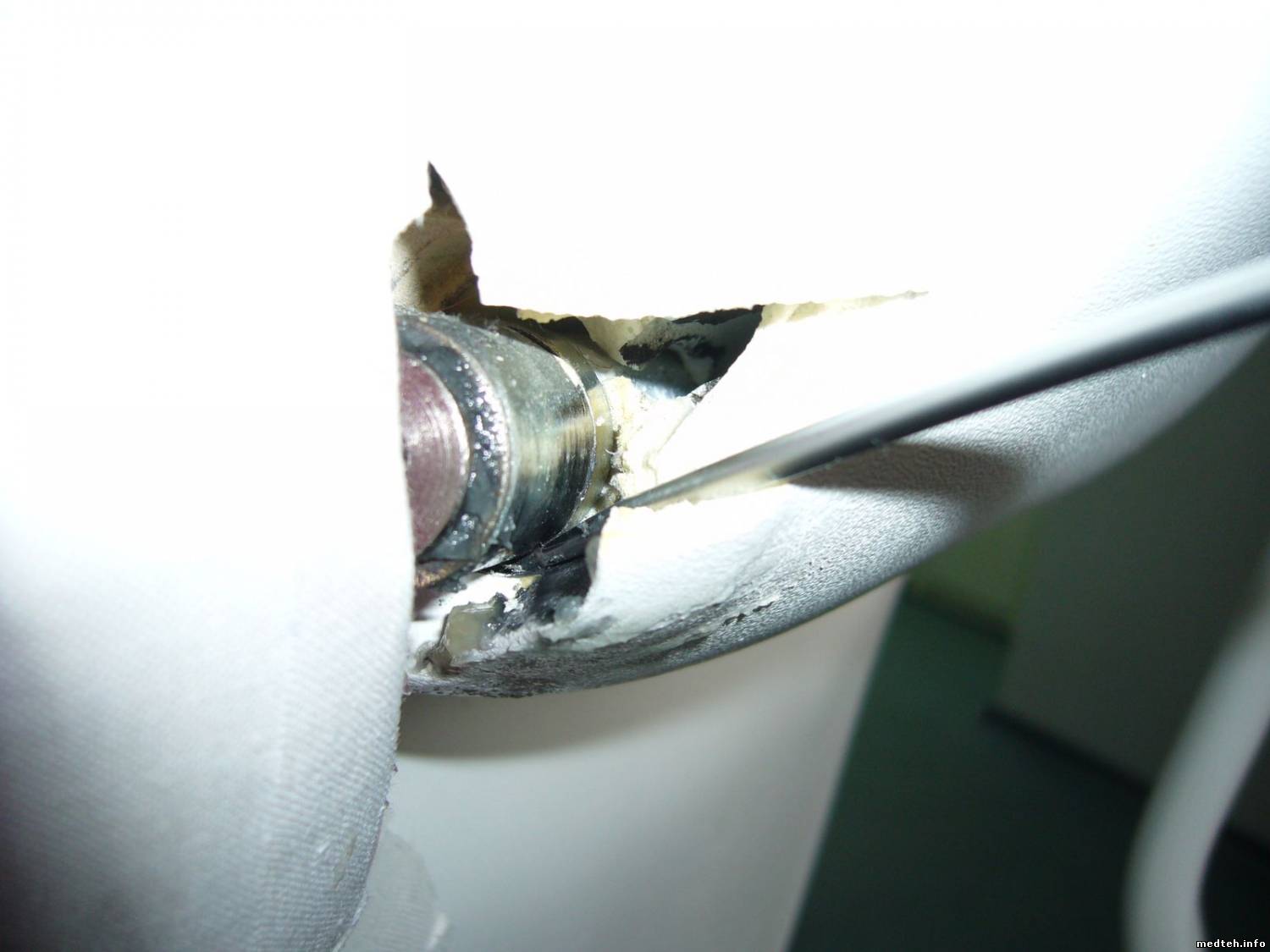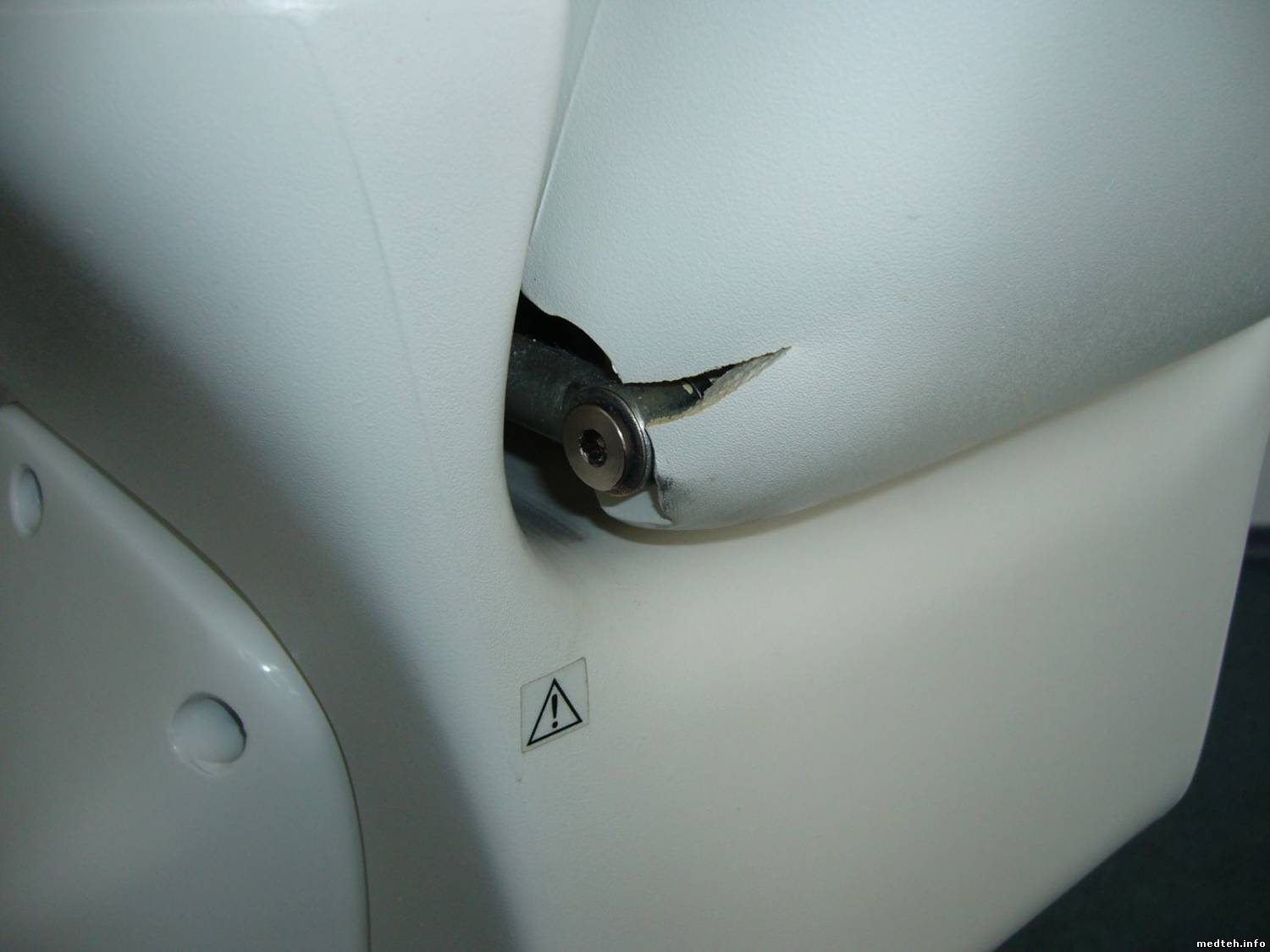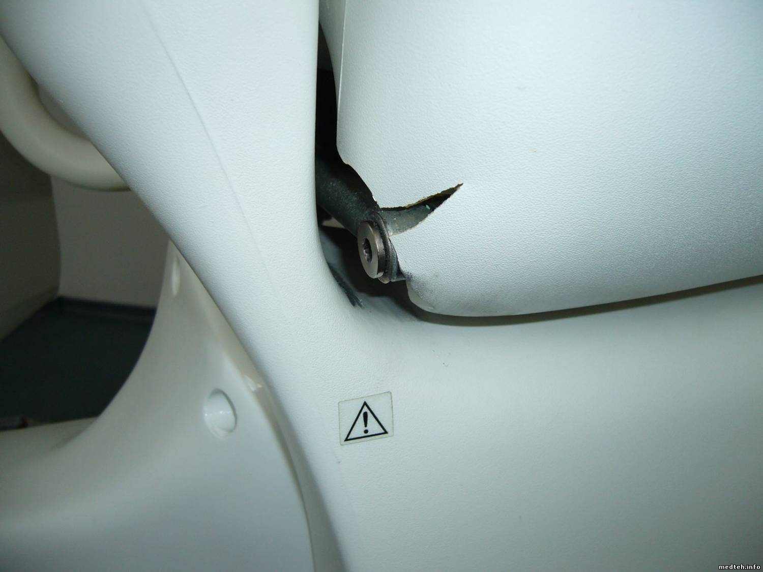 Стоматологическая установка EVRODENT ABCOLUTE. Подскажите как снять накладку со спинки кресла? Опыта мало. Крепится явно вверху, спокойно отодвигается на небольшое расстояние сбоку, но толком ничего не видно. Пробовал поднимать вверх (по ходу крепления) саму накладку - не идёт. Само повреждение на фото. Если кто сталкивался с подобным - подскажите как выходили из ситуации. Заранее спасибо.