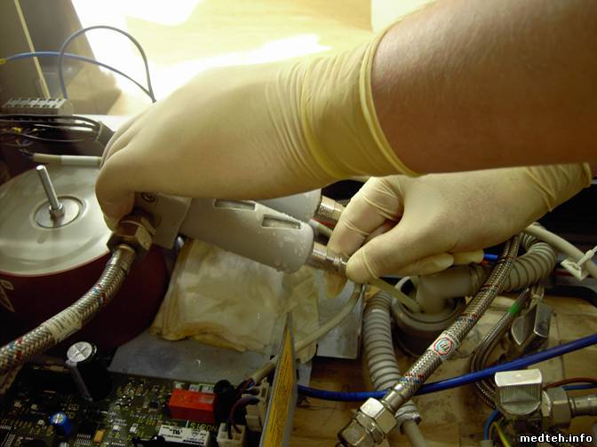 Установка Diplomat Economy (DE100). Жалоба: из пустера с воздухом брызгает вода. Сдёрнул с пустера воздушный шланг- вода в воздухе, с турбинного шланга тоже, раскрутил микромотор- мокрое гнездо. В компрессоре (ECOM DK 50) конденсата почти нет, в конце смены всегда открывают краник. Стравил весь воздух с компрессора и установки, вроде нет воды. На следующий день пришёл, та же ситуация.
