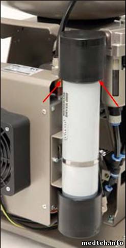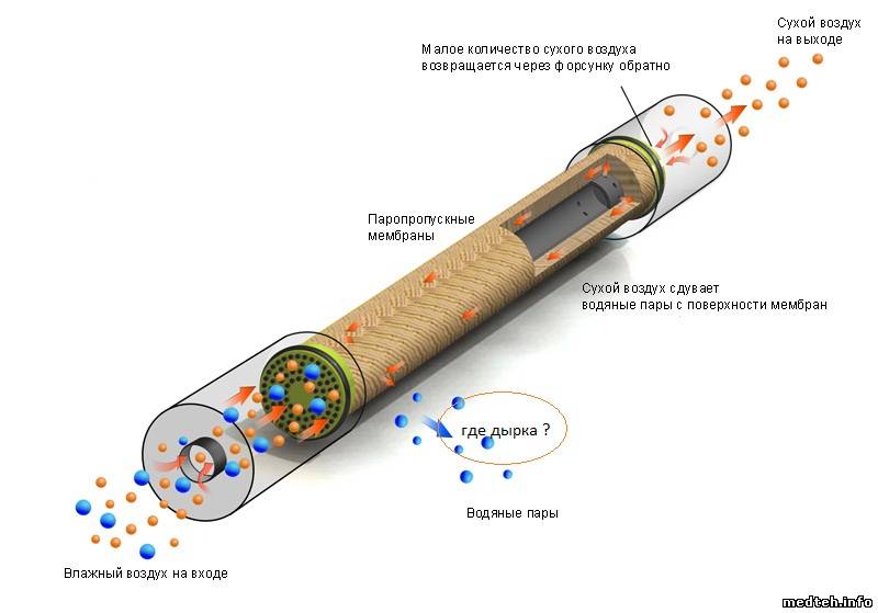 Ответ от EKOM: "Мембранные осушители относится к паропроницаемым мембранам, которые удаляют водяной пар из сжатого воздуха Сжатый воздух сначала фильтруется в сливающиеся фильтр. Этот фильтр удаляет жидкой воды и твердых частиц из сжатого воздуха. Водяного пара воздух затем проходит через центральное отверстие полого волокна в мембране расслоение. Водяной пар проходит через полые волокна мембраны. В то же время, небольшая часть сухого продукта воздух перенаправляется вдоль внешней поверхности волокон и собирает водяного пара, который пронизывает мембрану. Влажный воздух затем выбрасываются в атмосферу /1/, и чистый, сухой воздух подаётся в приложении. /1/ смотри две отверстия; диаметер 3-4 мм чуть под пластовой крышкой чёрного цвета. Влажность воздуха, выходящего из осушателя невоздействует повышению влажности окружающей среды. Мембранные осушители предназначены для работы непрерывно, 24 часа в сутки, 7 дней в неделю. Мембранные осуушители тихие, надёжные и не требуют электричества для работы. У мембранного осушителя примерно тратится 15-20 процентов воздуха /как монзун М1а/"