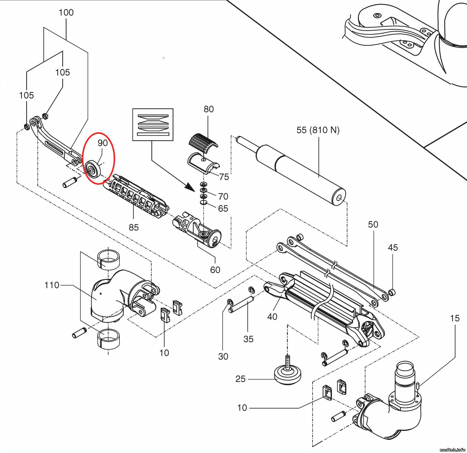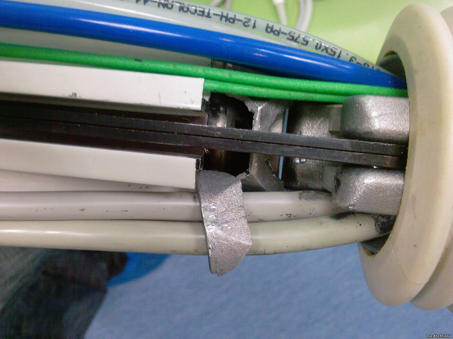 Причина: Из-за естественного износа, ослаб газовый амортизатор (а это вероятнее всего) и тогда стали сильно, до стопорения, затягивать регулятор усилия вертикального смещения врачебного столика (хотя это могли делать изначально, не зная предназначения регулирующего винта снизу) ... А многократные произвольные и непроизвольные попытки вертикального перемещения застопоренного столика приводят к смещению деталей пантографа, и, как в Вашем случае, к разрушению ... Сломанную деталь и, возможно, амортизатор менять ... Всё это не сложно ... Делайте аккуратно, чтобы не повредить шланги ... (тогда это станет проблемой ...). Перед разборкой обязательно заметьте как взаимно уложены шланги и кабель ...