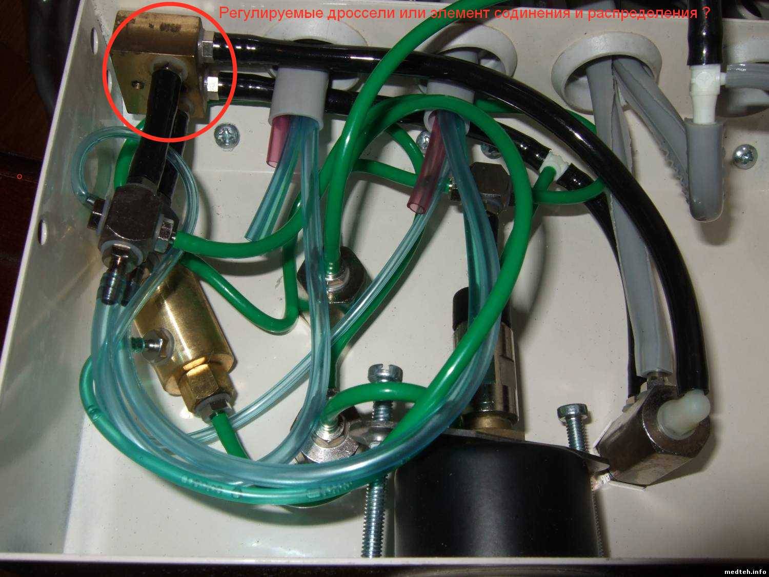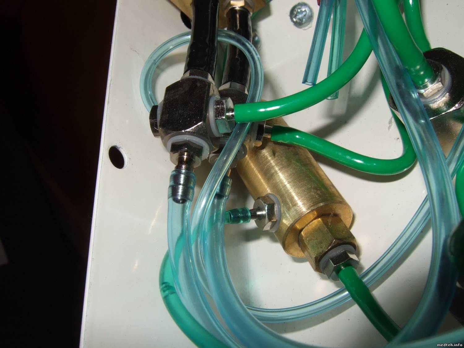 Более подробно: Вода контура с водой со входа идет сначала на регулятор напора, оттуда на реле водяное, с реле соответственно на инструмент, третий вход реле подключен к тумблеру включения подачи воды на инструмент, с тумблера этого идет на тройник воздушного контура, который стоит в разрыв трубки от тумблера переключения инструментов (первый/второй) к латунной прямоугольной штуковине в левом верхнем углу фотогравии, от этой штуковины через тройник-четверник (как эта метал штуковина называется?) на монометр, на инструмент и еще тоненькая трубочка совсем тоже на инструмент (и толстенькая и тоненькая голубого цвета, я так понял означает что они воздушные)