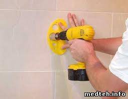 чтобы не было сколов в облицовочной плитке надо просверлить её трубчатым алмазным сверлом диаметром на 2мм больше чем используемый дюбель.перед сверловкой надо отрезать от одноразового стаканчика буртик шириной 2см ,приклеить его пластилином к полу, или сделать буртик из пластилина и заполнить наполовину водой .также трубчатым алмазным сверлом удаляется ленолеум перед сверловкой.