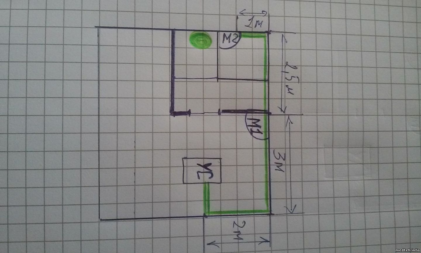 Я все понимаю, но вопрос сейчас стоит о том как это сделать бюджетно и аккуратно.Скорее всего будем рассматривать варианты без подключения к канализации((. Это главный вопрос, понятно что вода и воздух проще решаются. Я скину схему помещения , УС--установка, зеленым планирующийся канализационный вывод, М1--мойка в кабинете, М2 мойка в подсобке, а сама канализационная труба зеленым кружочком, это туалет. Имеет ли смысл это городить, учитывая, что наклона там не будет, но можно поставить помпу в подсобке, или в мойке в кабинете. Или не заниматься ерундой и искать установку, не требующую подключения к канализации?