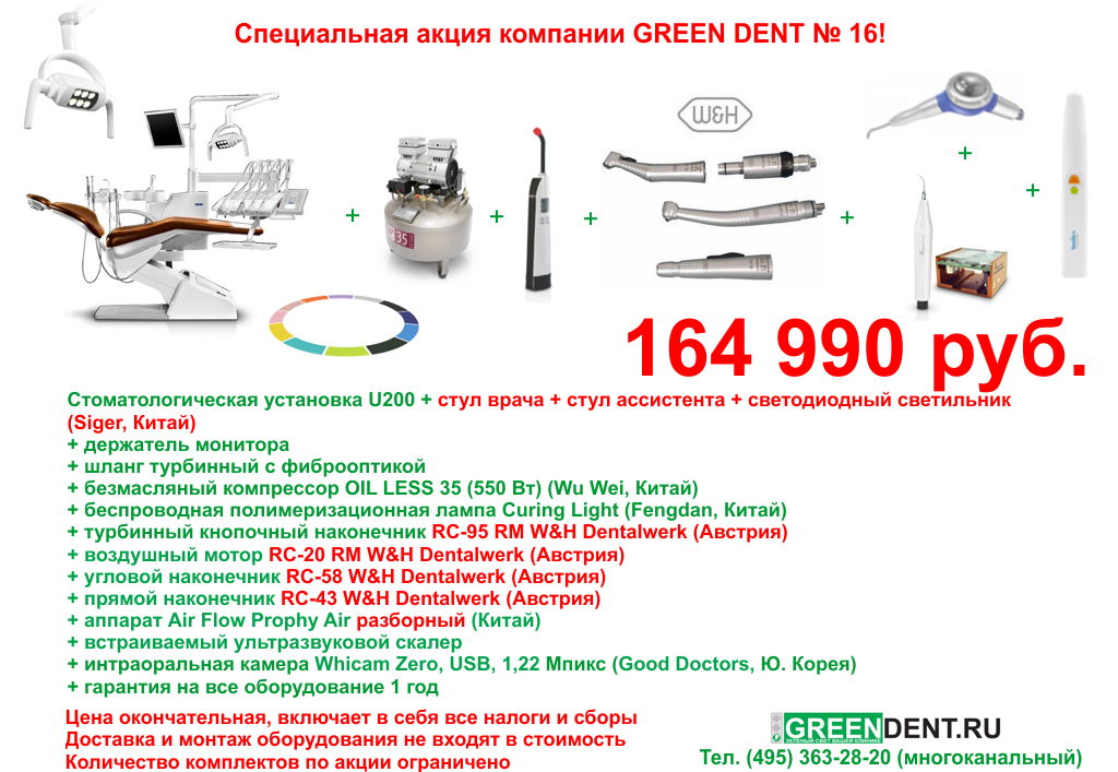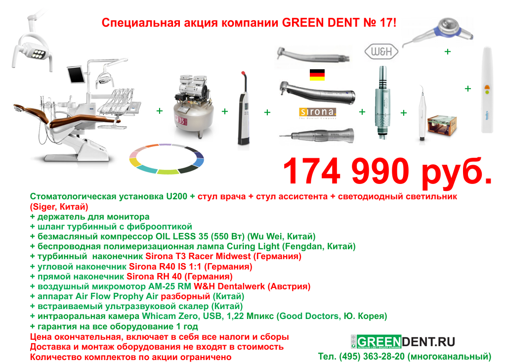 по правде,я немного далек от всего этого. я коммерческий директор,это партнерша врач-стоматолог,который в данный момент работает на ужасном оборудовании. поэтому она согласна и на то,что предлагают по акции. тогда как мне не хочется платить за то,что втюхивают и уж тем более если это фуфло. есть три варианта установок U200(в аттаче) думаю,либо брать два полностью укомплектованных предложения. либо один из них(с сироновскими наконечниками получается выгодней,считал по отдельности все составляющие комплекта) и один по третьему варианту(установка с интероральной камерой) с отдельной докупкой всего остального. если брать наконечники отдельно,то что посоветуете из предложений по этой ссылке: http://www.greendent.ru/index.php?option=com_content&view=article&id=121:spec6&catid=35:akciirazdel&Itemid=192