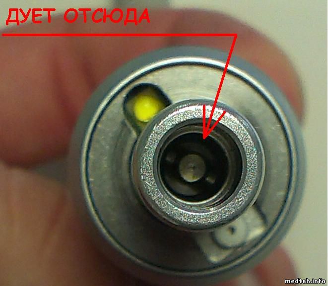 Воздух из микромотора выходит через отверстие (соединения) вала (потом проходит через наконечник(угловой) и выходит через носик (там, где бор)). Сделал вывод, что это конструктивная особенность. Немного уменьшил подачу охл.воздуха. Фото прилагаю.