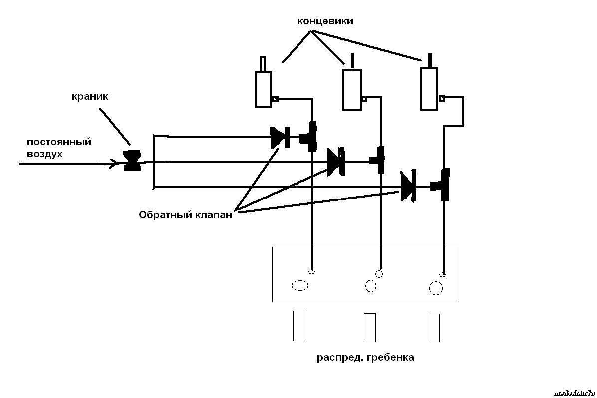 Реализовал сегодня затею по поводу китайской гребенки на A-dec по прикрепленной схеме. казалось бы работать должна на ура. Но нет! Первая проверка прошла успешно - поочередно проверил все шланги. Второй раз начал проверять - из центрального шланга по нарастающей стал выходить воздух на раскрутку турбины, потом пошла вода - значит когда я взял первый шланг каким то образом из центрального клапана на гребенке ушел воздух и клапан открылся. Чтобы не было таких моментов я поставил обратные клапана. Но очевидно не помогло! Причем иногда все работает, а иногда работают два шланга. Пока как доработать эту систему идей нет! Прошу поделиться опытом!