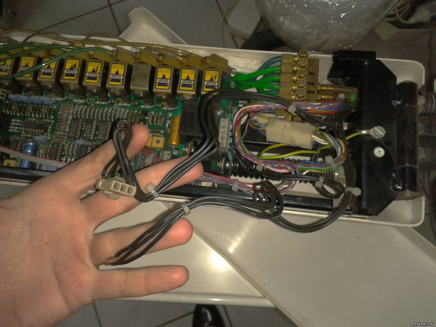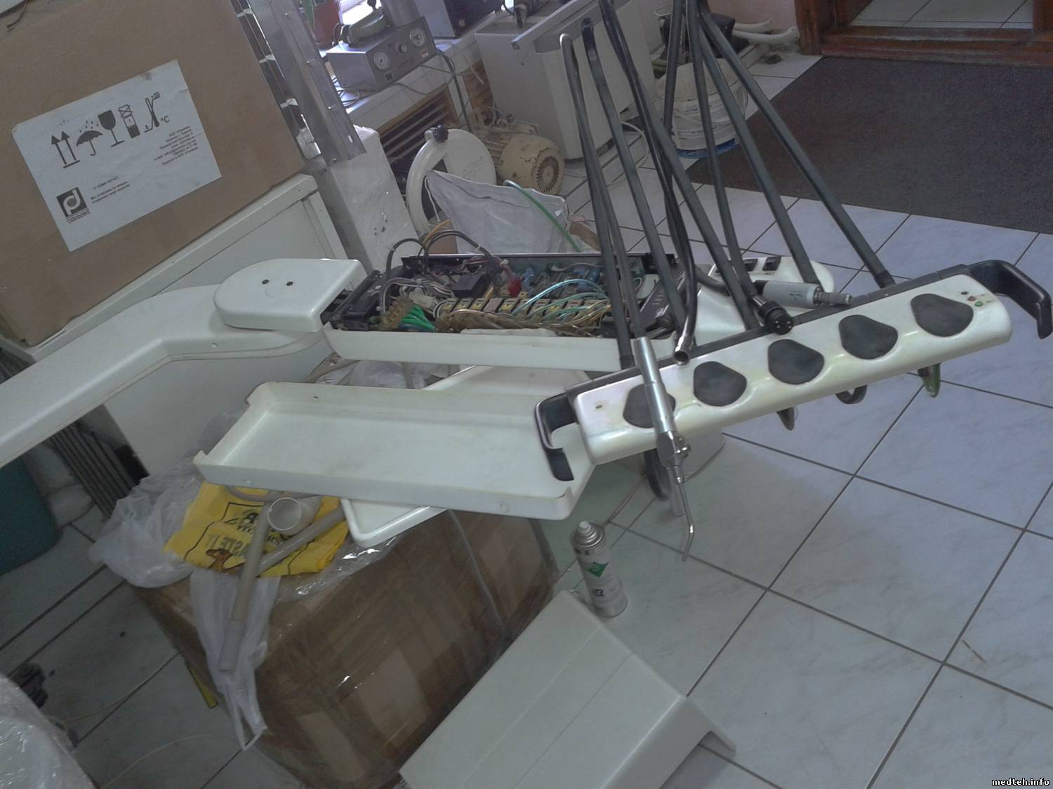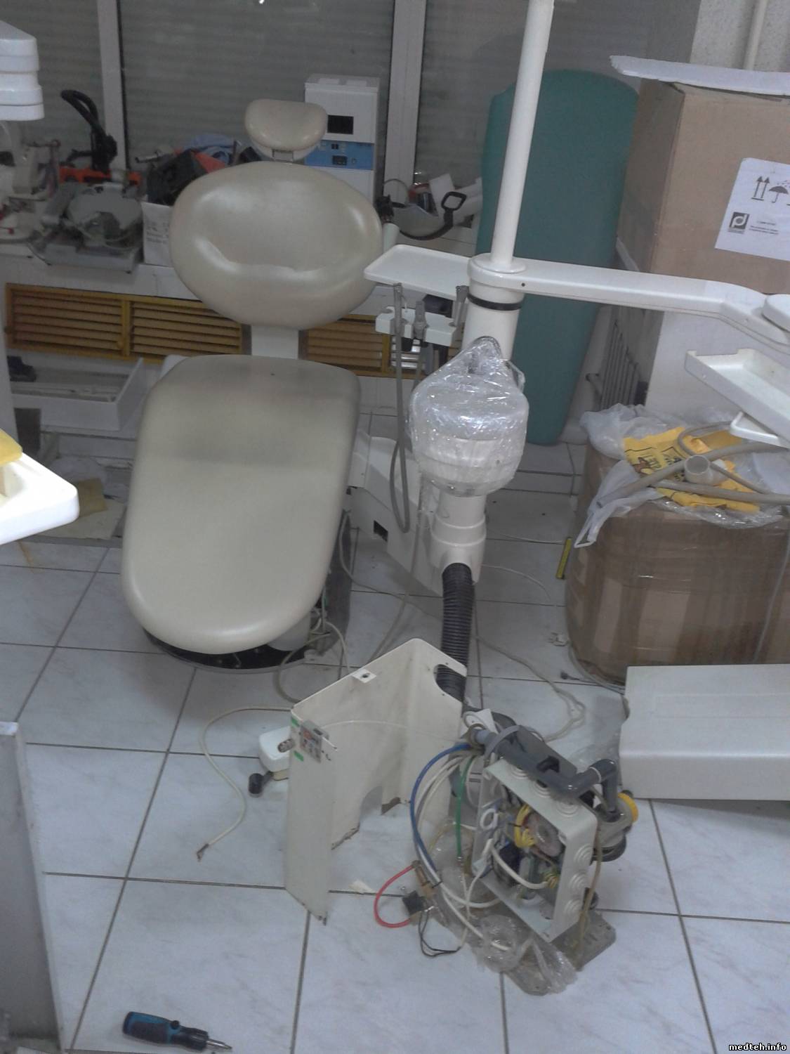 Комутацыонную коробоку к полу нужно крепить таким образом что бы при максимально поднятом или опущенном кресле гофра со шлангами сильно не перегибалась...далее монтаж навесного оборудования (светильник и т.д и т.п) установка оснащена слюноотсосом и пылесосом! а помпа есть??? я бы еще с кресла и обивку снял что бы представить все как есть...