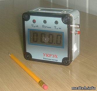 . Устройство контроля радиационных и электрических характеристик рентгеновских аппаратов УКРЭХ (малогабаритный рентген-тестер) Для бесконтактного измерения высокого анодного напряжения, приложенного к рентгеновской трубке, мощности экспозиционной дозы рентгеновского излучения и длительности времени экспозиции, для применения при техническом обслуживании рентгенодиагностических аппаратов в условиях эксплуатации в медицинских учреждениях, при технической паспортизации рентгеновских кабинетов, а также при приемо-сдаточных испытаниях на заводе изготовителе, при ремонте и настройке на ремонтных предприятиях. Диапазон измеряемых высоких напряжений от 40 до 125 кВ. Погрешность +/- 5,0%.