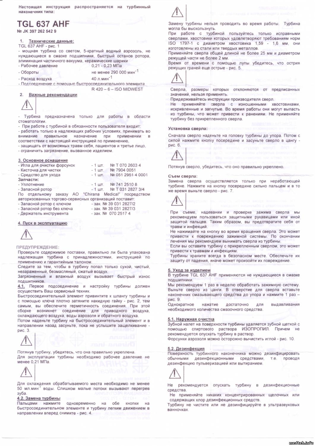 Документом для Вас является инструкция от производителя, находящаяся в коробке с наконечником. Не будет производитель указывать, что нельзя, нет в этом здравого смысла: ранее я привёл пример из инструкции к немецкому изделию, условно аналогичному. Он указывает однозначно, что делать, как ухаживать. Требуется прочитать и принять к исполнению. Что ещё непонятно? Необычно? Да! Но не сомневайтесь в правильности написанного в инструкции - тщательно выполняйте все её пункты: при отказе наконечника в гарантийный период одномоментно (!) прекращайте его эксплуатацию, проведите очистку и стерилизацию по инструкции и с полноценным сопроводительным актом возвращайте в штатной упаковке поставщику. Именно так представляет процесс производитель. Практический опыт есть - ничего особенного, так же как и обычные TG. Не доживали до конца гарантии по объективным причинам (нарушение правил эксплуатации) Внутри головки - уголь...Спроса не было, боле сказать нечего. Вообще, при продвижении изделий с новыми технологиями требуется внятный, доступный для понимания пользователя инструктаж от "грамотного" дилера, с ответами на все возникшие вопросы. Это вы имеете? Наверное, нет. Большого, массового распространения данное изделие не получило - причина, полагаю, в не готовности потребителя к иным правилам эксплуатации. По практике, полагаю в ортопедии он проработает дольше, чем в терапии (если представить идеальные условия)