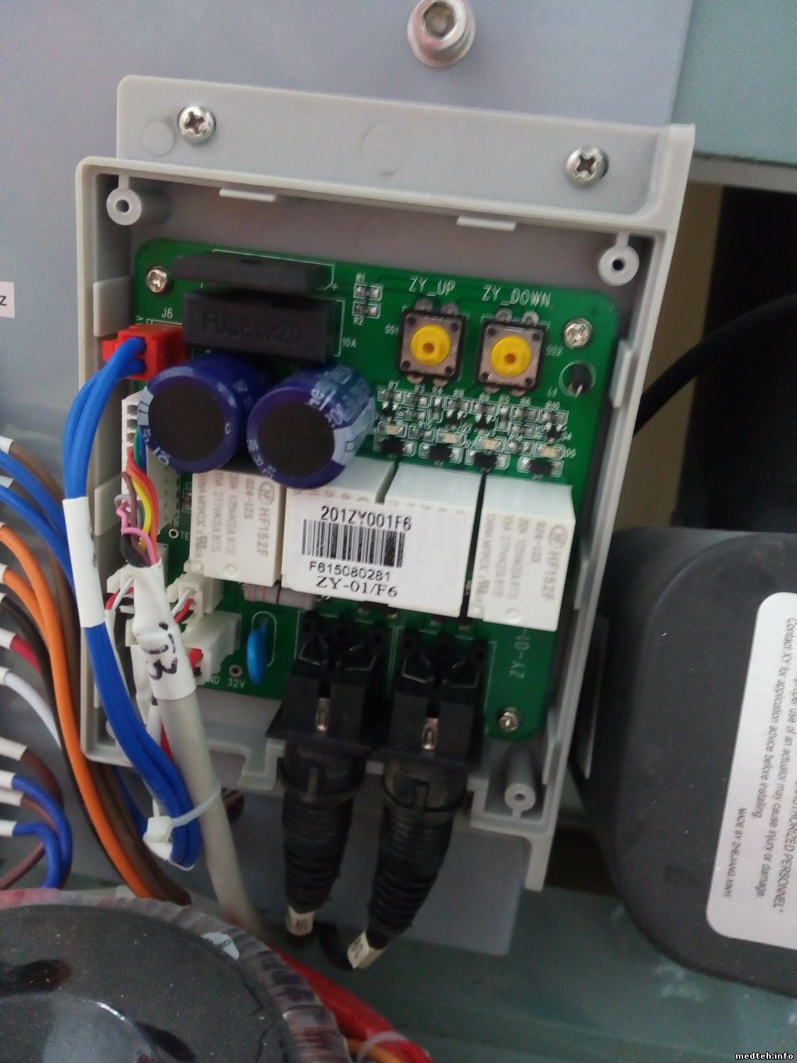 При первом включении питания тумблером, что под креслом, раздается короткий писк и всё. Кнопки на пульте врача, ассистента и педаль не реагируют. На плате гидроблока горят два зеленых светодиода +5V и +12V, светодиод Run не горит. Если тумблер питания отключить, немного подождать и снова включить, то раздается длинный писк (около 3 сек), на это время Run загорается и потом снова тухнет и никакой реакции на нажатия кнопок нет. При нормальной работе установки(сегодня утром включили, она немного поработала, кресло шевелилось, свет горел, потом опять всё пропало) светодиод Run медленно мигает. При том, когда пульты не работают, кнопки ручного управления на плате приводов работают, кресло вверх/вниз ездит. Фото прилагаются.