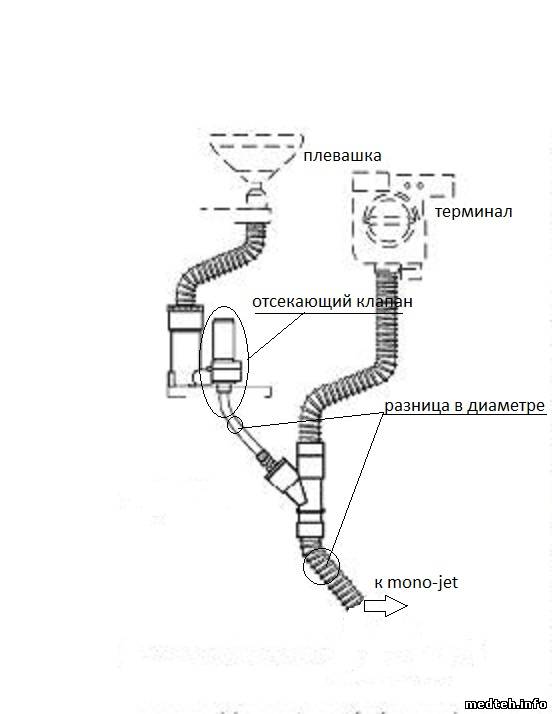 При подключении плевательницы к Моно Джет, дабы избежать неприятных звуков в плевательнице, придется установить запирающий клапан, срабатывающий при включении аспиратора.