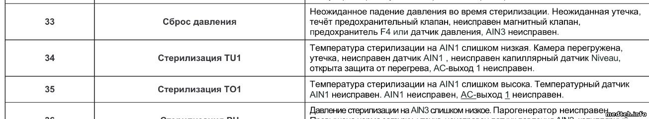 Ошибка означает, что за 15 минут не достигнуто давление во время фракционирования или не достигнута температура стерилизации/дизинфекции.