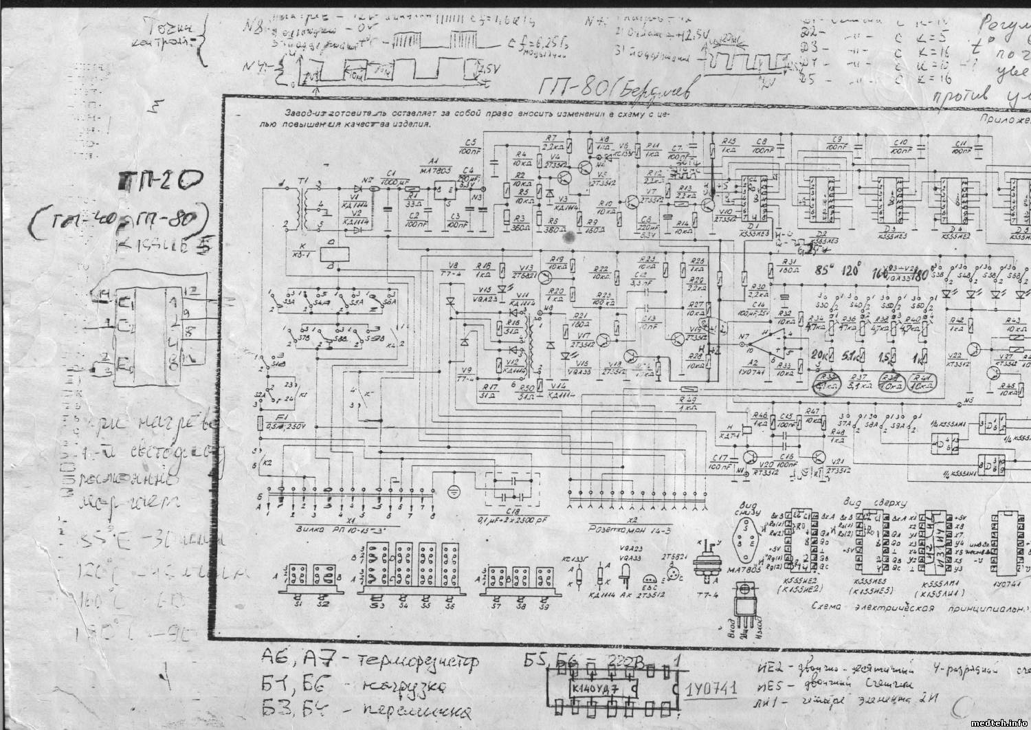 Проблема такая: не горит лампа индикации температуры при включении, не открываются тиристоры на ТЭНы. Было заменено: тиристоры, операционник 140, термодатчик СТ1-19, а также все кондёры в схеме. Ничего не помогает ...