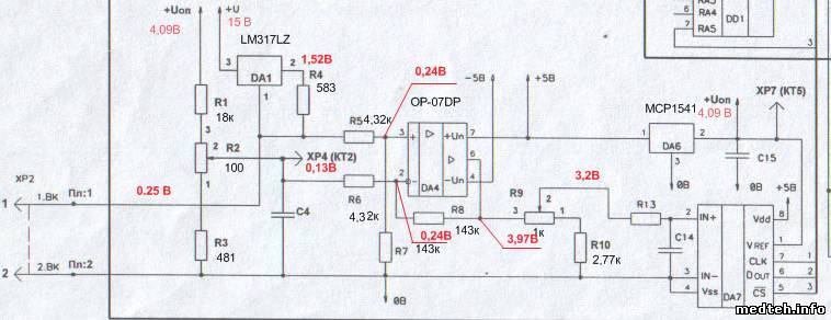 Воздушный стерилизатор при включении показывает температуру более 200 градусов. Проверил датчик - показывает около 100 ом (при комнатной температуре) - вроде, нормально. Заподозрил неисправный операционник DA4 (OP-07DP) - поменял. Результата нет. Поменял Стабилизатор тока DA1 (LM317LZ) Ничего не изменилось. Проверил номиналы всех резисторов - всё в норме. Может всё-таки датчик должен быть не 100 ом при комнатной температуре? Либо что-то не доглядел. Требуется режимы работы с рабочего стерилизатора, но другого такого в округе не наблюдалось. Может кто уже сталкивался и законспектировал, либо в ближайшей перспективе столкнётся ... Буду признателен. Особо интересно напряжение в контрольной точке КТ2 и на выводах 2,3,6 микросхемы DA4. Прилагаю кусочек схемы с измеренными режимами и номиналами для удобства, измерял при средних положениях подстроечных сопротивлений R2 и R9. При этом, на индикаторе показывает температуру 320 градусов. В хранилище есть полная схема с перечнем элементов на ГП-80 СПУ, пульт такой же.