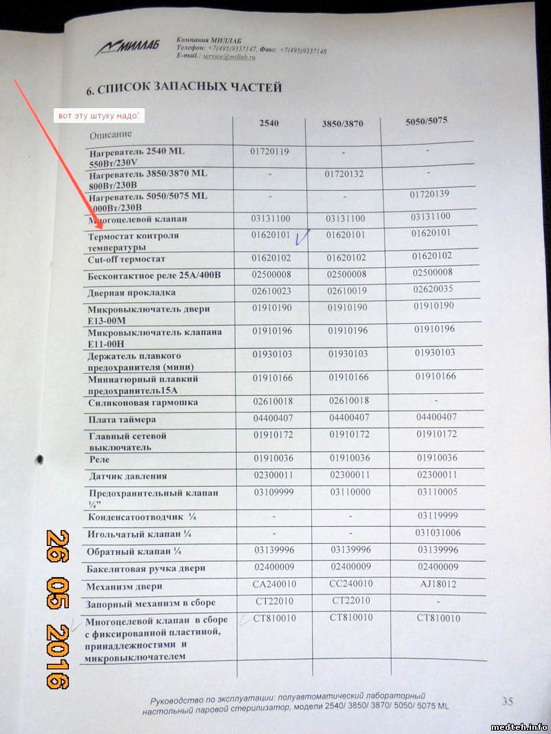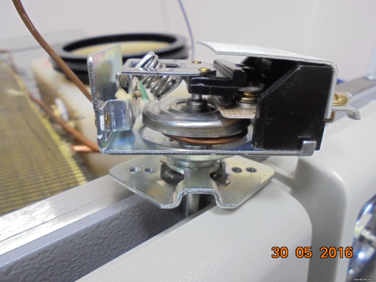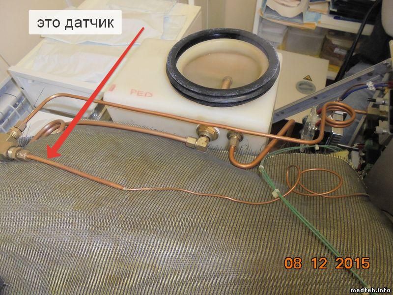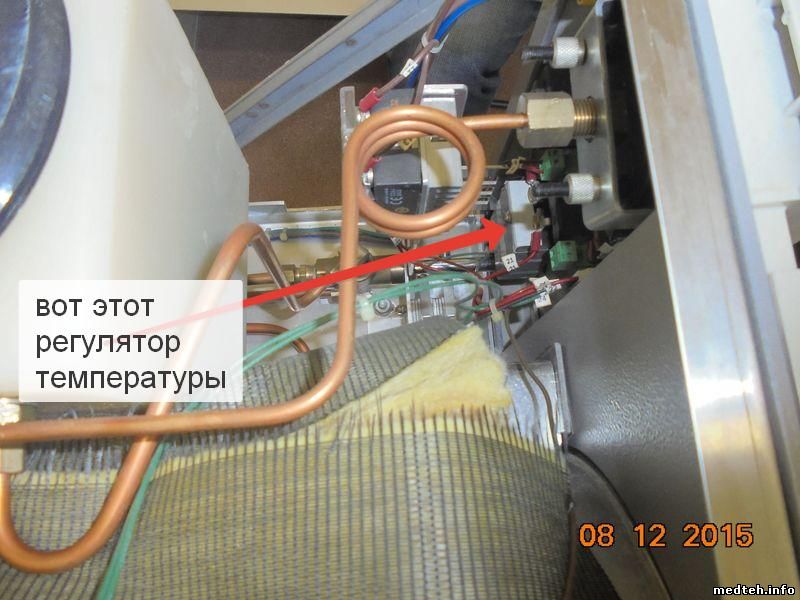 То-же говорят мне и в авторизованном головном сервисе компании МИЛЛАБ. Осталось определиться с регулятором температуры. Что это? Каков принцип? Какое истинное название? Тамошний инженер его называет "Прессостат", в списке запчастей он значится" Термостат контроля температуры". Постараюсь пояснить фотографиями. Да, я могу вручную повернув его чутка по часовой стрелке увеличить температуру в камере до необходимой, и тесты пройдут(проверено) тогда давление на манометре ещё более увеличивается, а это крайне раздражает медсестру, которая однажды что-то перегрела и "попалила".
